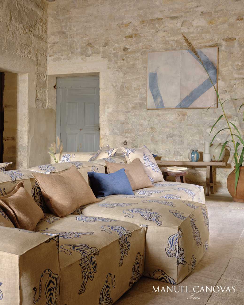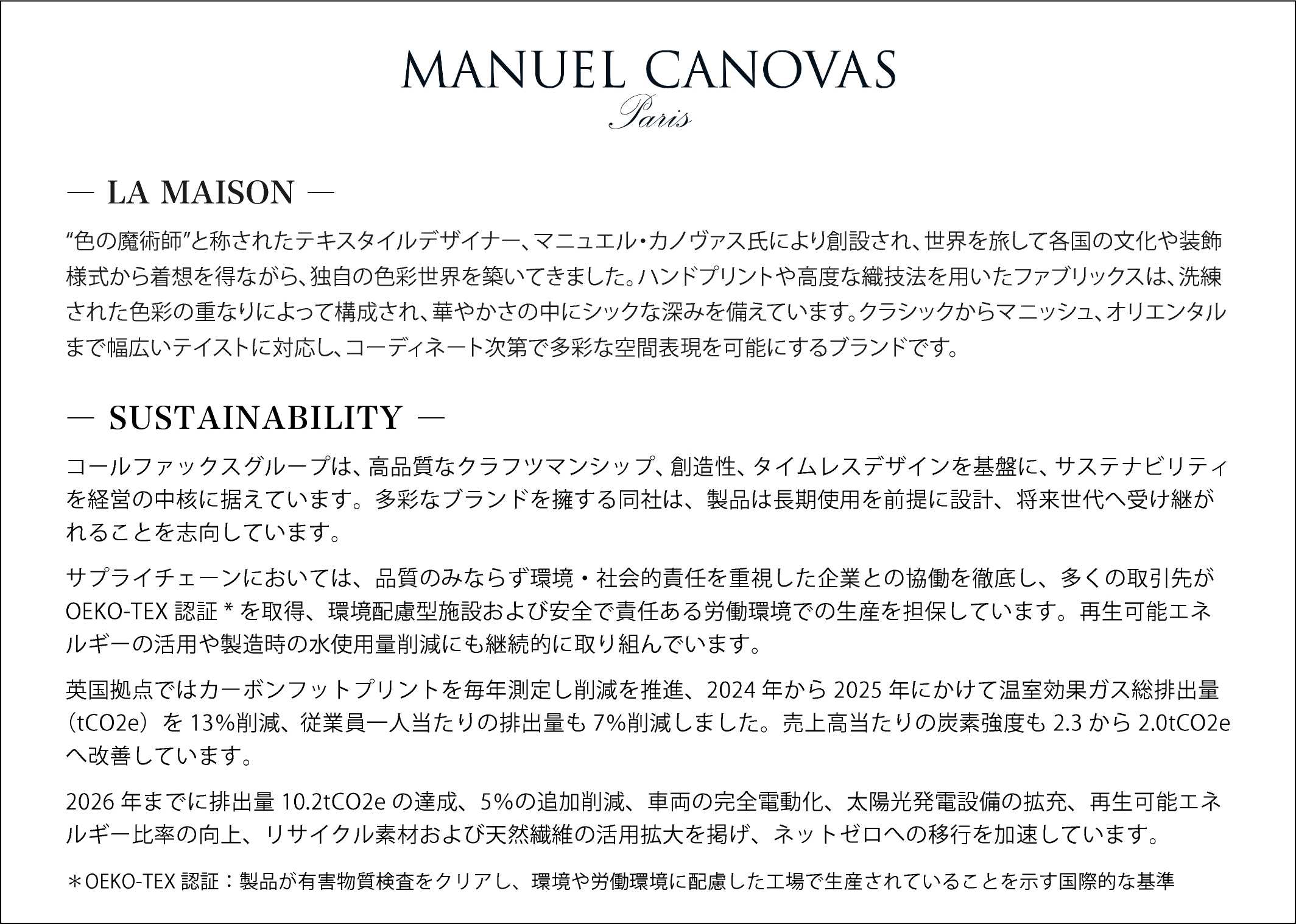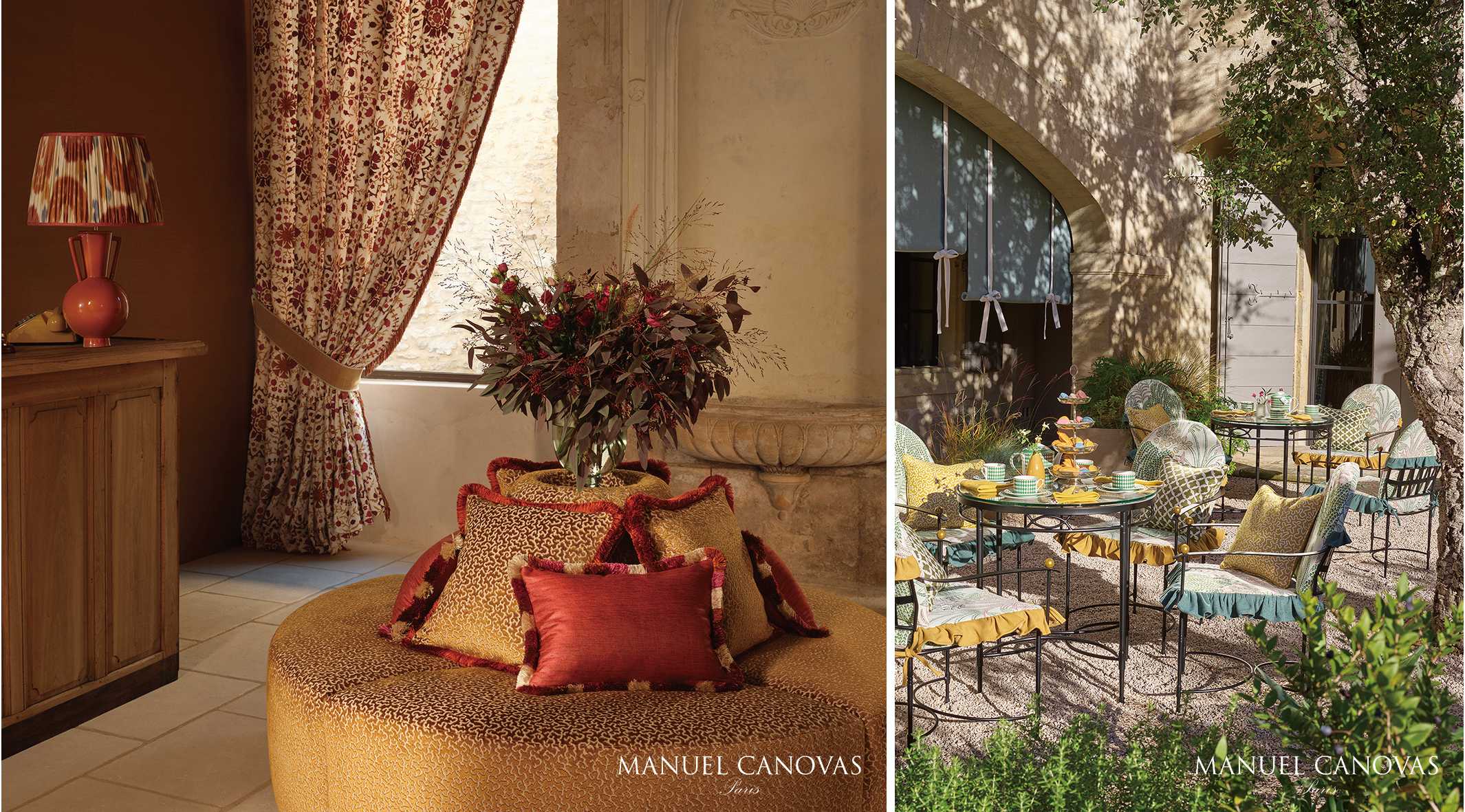 今回の新作は、ブランドの装飾哲学を包括的に表現する“Hotel Canovas(ホテル カノヴァス)” という、南仏プロヴァンスを舞台にしたファブリックスコレクションです。装飾プリントや刺繍、立体感のあるラグジュアリーなベルベット、表情豊かな織、純リネンのストライプ、さらに屋内外で使用可能な高性能素材までを網羅し、ブランドを象徴する豊かで洗練されたカラーパレットのもと、歴史と現代、東西の装飾文化が軽やかに交差します。