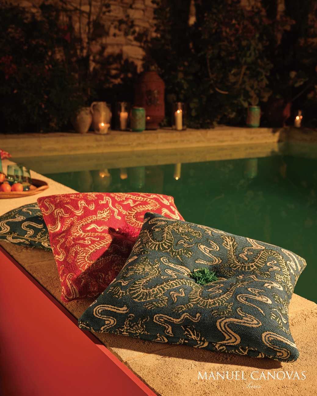 屋内外での使用が可能な、東アジアの歴史的タペストリーに着想を得た水龍柄のファブリックスです。