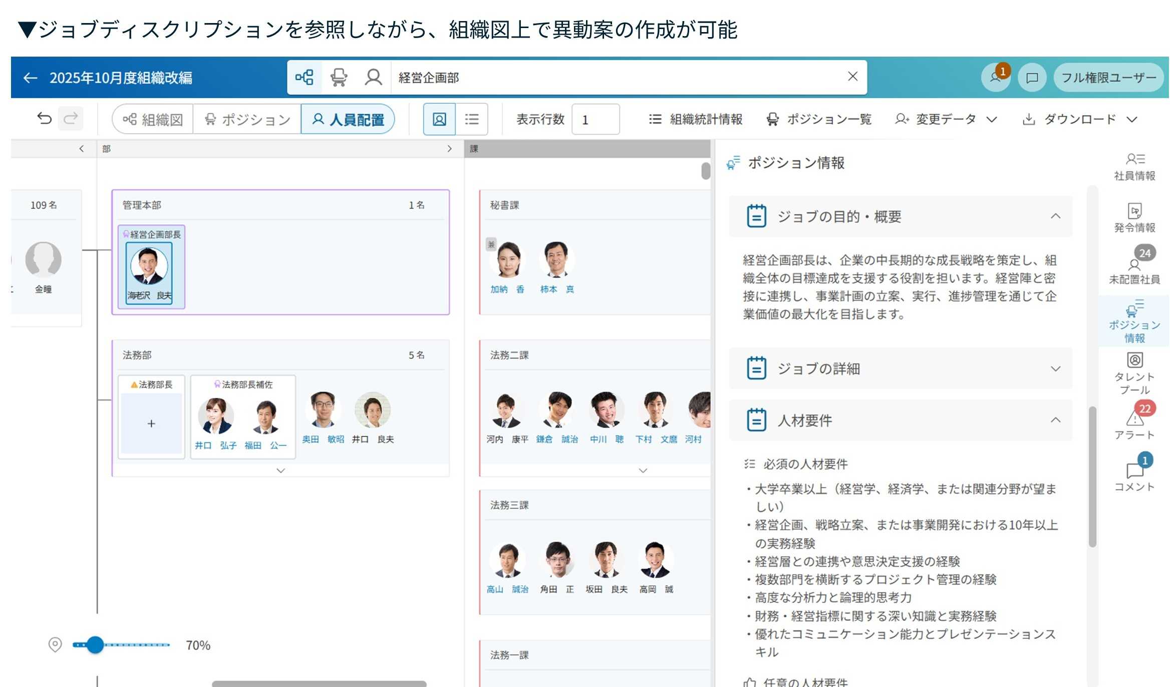 本機能で作成したジョブディスクリプションを組織図上で参照しながら、誰をどのポジションに配置するかの検討を行えます。また、確定した組織・配置の情報は「COMPANY® 人事・給与」のデータベースに自動連携