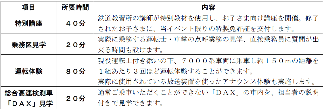 実際に当社運転士が乗務の際に使用している携行品のプレゼントや、通常ご乗車いただくことができない総合高速検測車「DAX」の車内見学会も実施します。