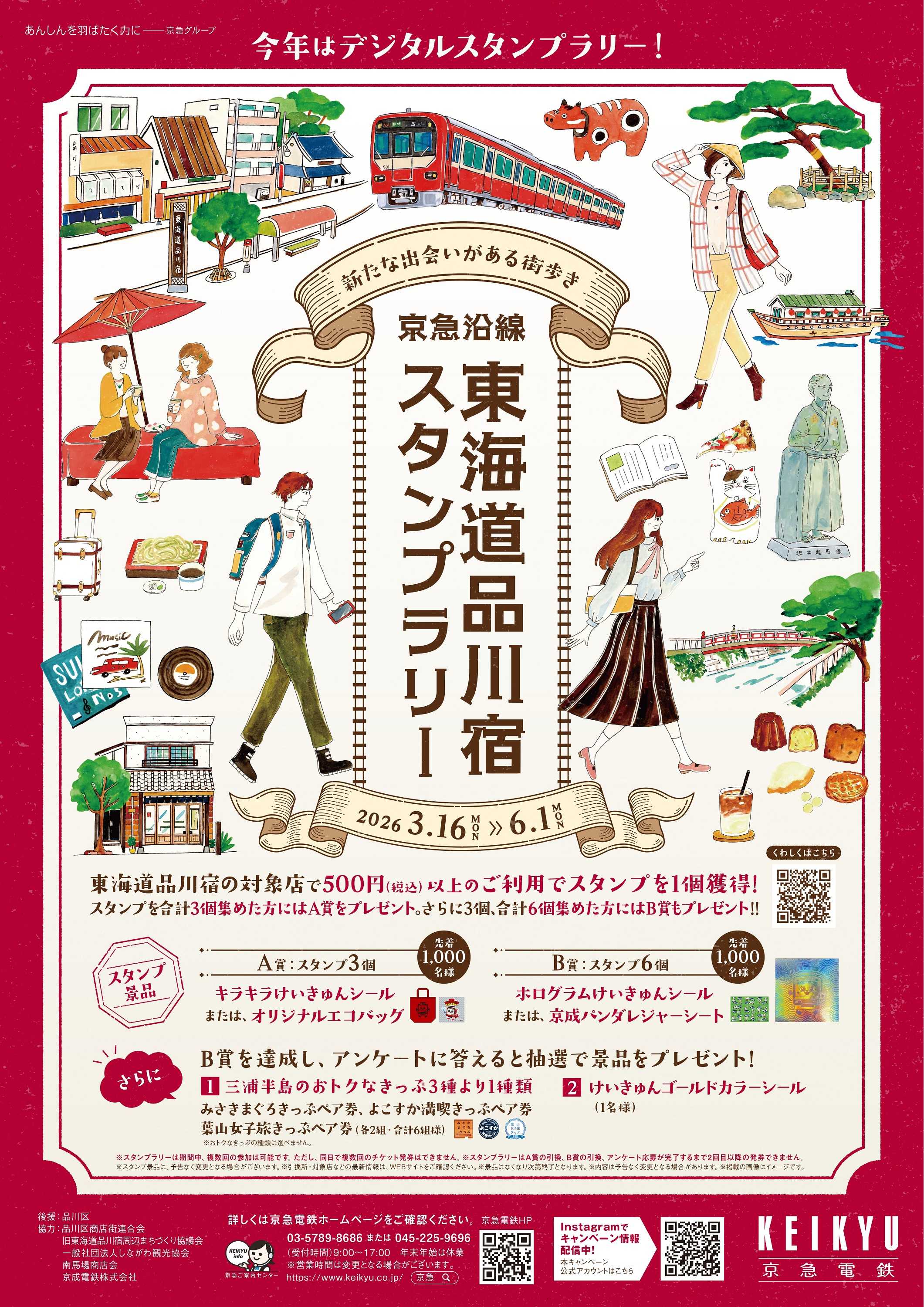 京急線(北品川駅~立会川駅)旧東海道の商店街や周辺にある対象店舗で500円(税込)以上利用してスタンプが獲得できる,デジタルスタンプラリーで,2025年10月に京成電鉄株式会社(以下 京成電鉄)と締結した共同検討に関する合意書に基づき,京成電鉄から本キャンペーンの一部景品の協力を得て実施するものです。