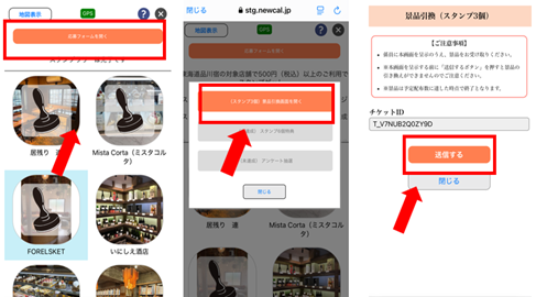 スタンプを必要数量獲得後に「応募フォームを開く」をクリックすると景品引換,景品応募フォームに進みます。景品引換はスタッフに画面を呈示し引換ください。アンケート必要事項を入力のうえお申込みください。