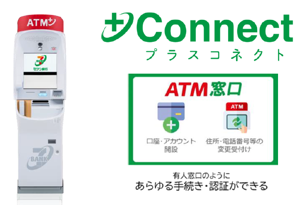 「+Connect」(プラスコネクト)はあらゆる手続き・認証をセブン銀行ATMで実現するサービスの総称です。その中に、これまで窓口にて対面で行う必要のあった口座開設や住所・電話番号変更などの各種手続きを、原則24時間365日行うことができる「ATM窓口」サービスがあります。
