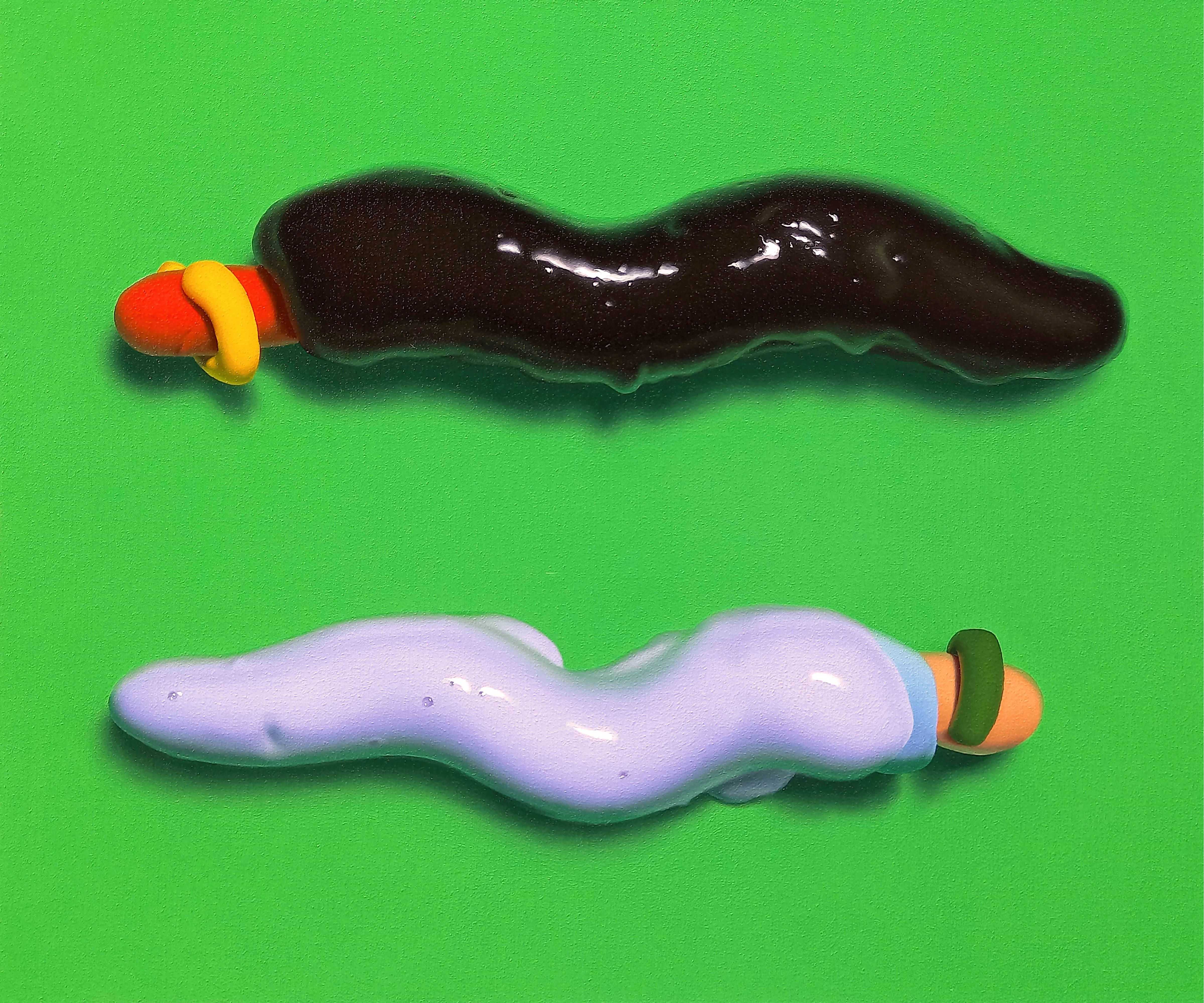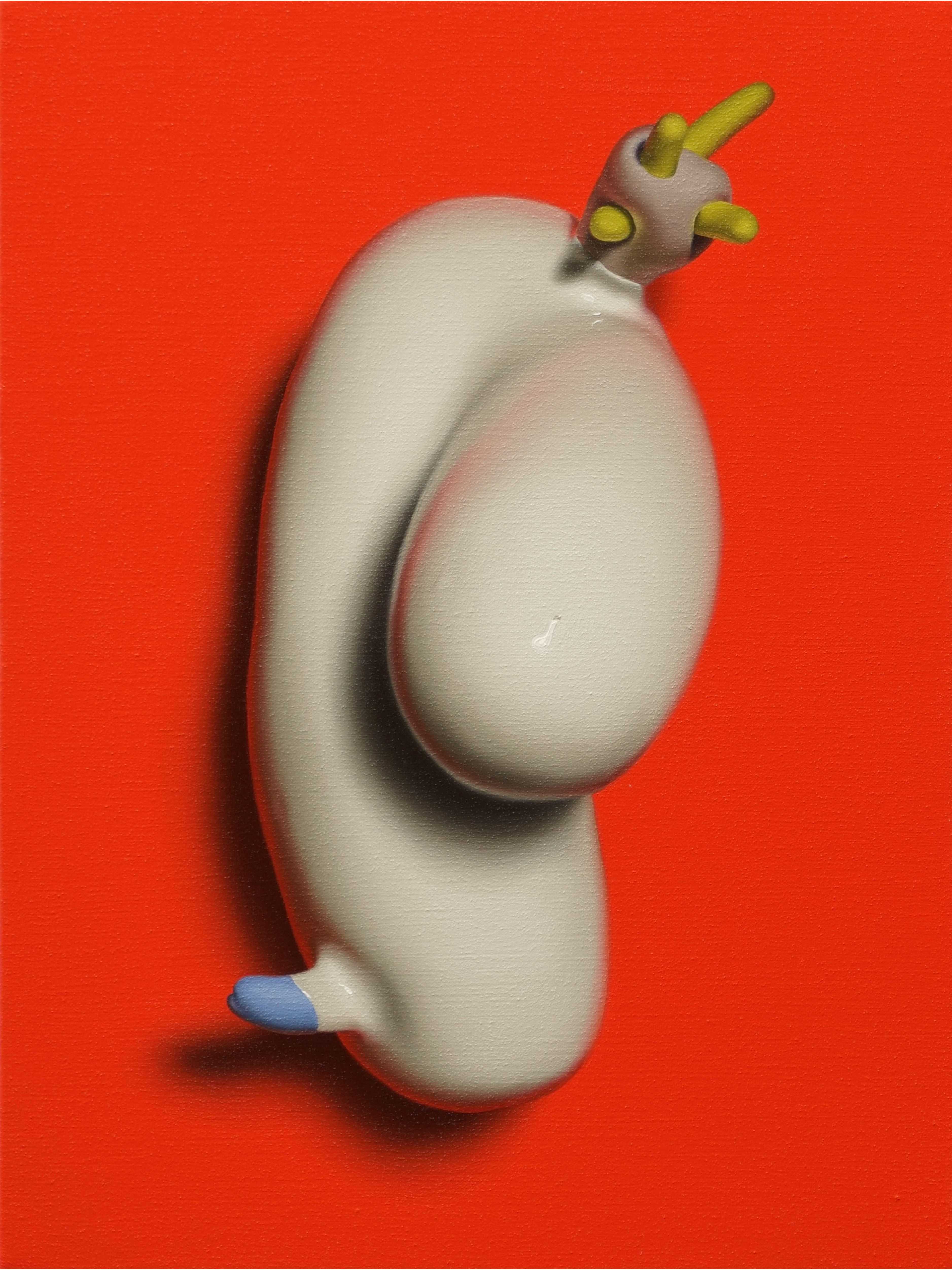 作品が私の手を離れた途端、奇妙な感覚にとらわれることがある。私は、粘土や絵具そのものを用いて立体物を自作し、それらを写実的に描くというプロセスによって作品を制作している。しかし、完成した作品を前にすると、単なる色や形に過ぎなかったものが、いつの間にか質量や独自の質感といった具象性を自ら獲得していったかのような錯覚に陥ることがある。そのとき、私が目にしているものはいったい何なのだろうかという漠然とした不安がよぎる。偶発的で遊戯的な立体制作と、計画的で機械的な写実描写という相反する二度の造形行為を経ることで、「抽象」と「具象」をはじめとする様々な二項対立が一つの画面に同居する。作品はそのいずれにも着地することなく、名前のない状態でプカプカと浮かんでいるように思える。