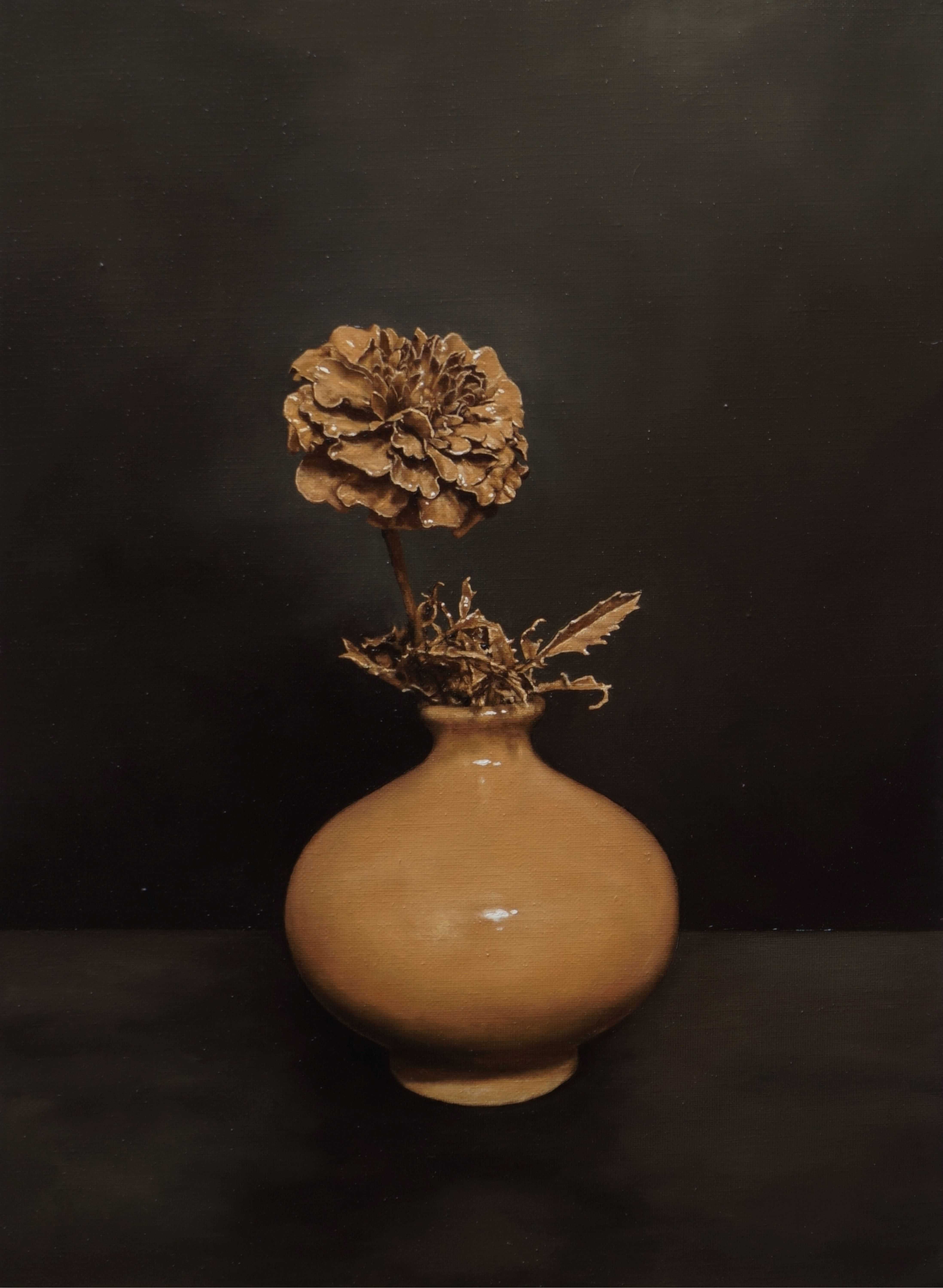 花を塗装して、フィギュアに見立てる。“リビング・フィギュア”と名付けたこのシリーズですが、塗料がなぞった形は、死を内包した生の痕跡のように感じられます。虚と実、そして生と死に対する私の認識を、花はただ不確かなものとして、ただ形として示しているように思えました。