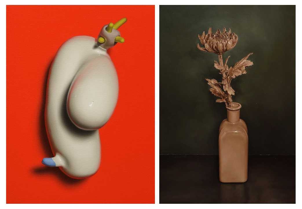 木原健志郎は、塗装した花をフィギュアに見立てて描く「リビング・フィギュア」シリーズを通して、生と死という相反するイメージをひとつの画面に立ち上げます。一方、木原幸志郎は、粘土や絵具で形づくった抽象的なオブジェをモチーフに、写実的な絵画表現へと置き換えることで、抽象と具象が同時に存在する感覚を描き出します。モチーフや制作工程は異なりつつも両者に共通するのは、相反する概念が同居する瞬間を絵画の中に見出している点です。2つの展示は館内の通路をつなぐように配置され、鑑賞者は作品の世界を行き来しながら、複数の視点が交差する体験を得られます。