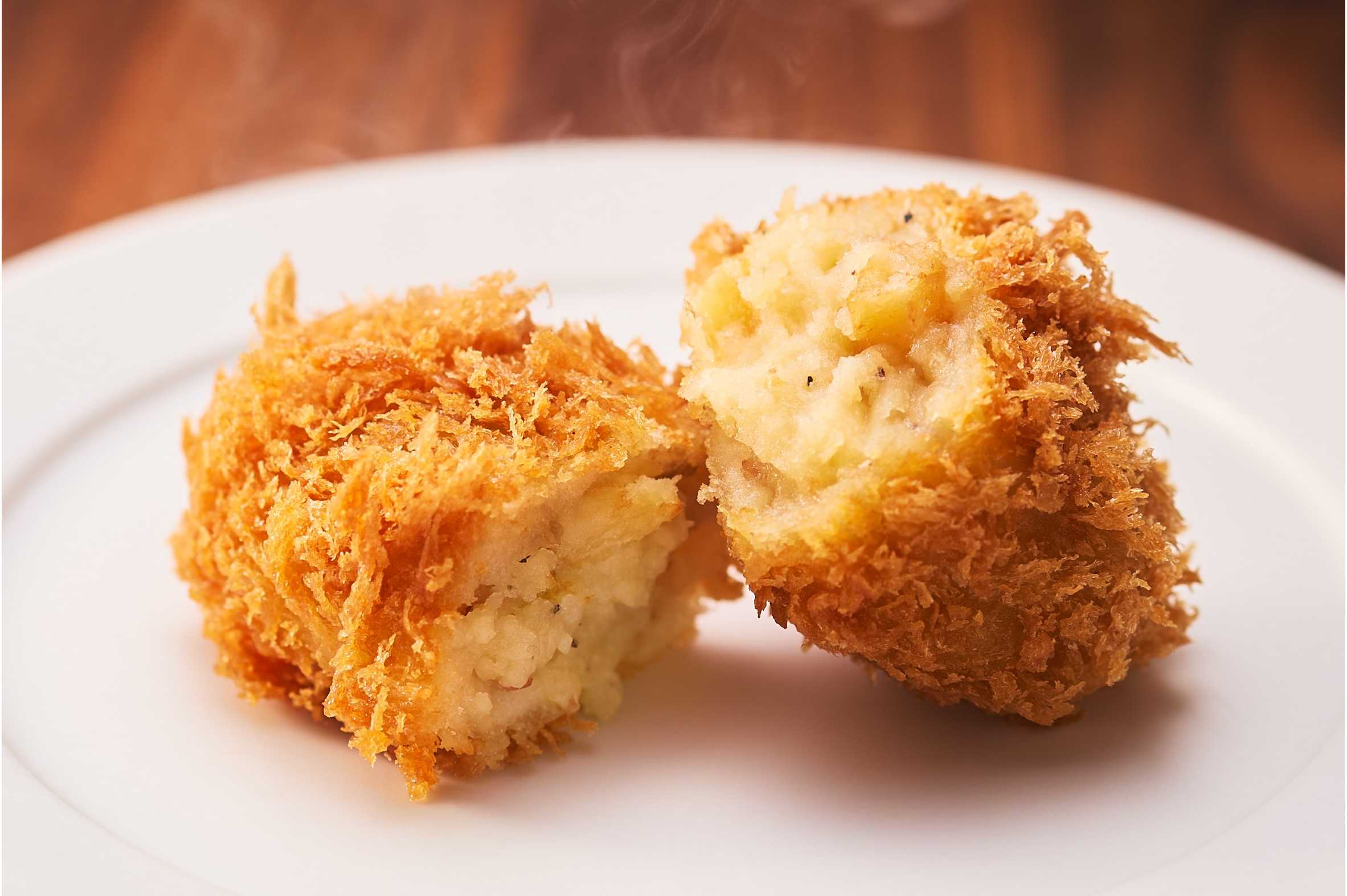 北海道北見市端野町産のゆめいころのおいしさを活かした、これまでにないふわもち食感のポテトコロッケ。きめが細かくなめらかな口当たりのゆめいころをベースに、中にも香ばしく揚げたダイス状のゆめいころを入れています。味わいは素材を引き立てる自社製のブイヨンに、ほんのりベーコンの旨みをプラスしています。