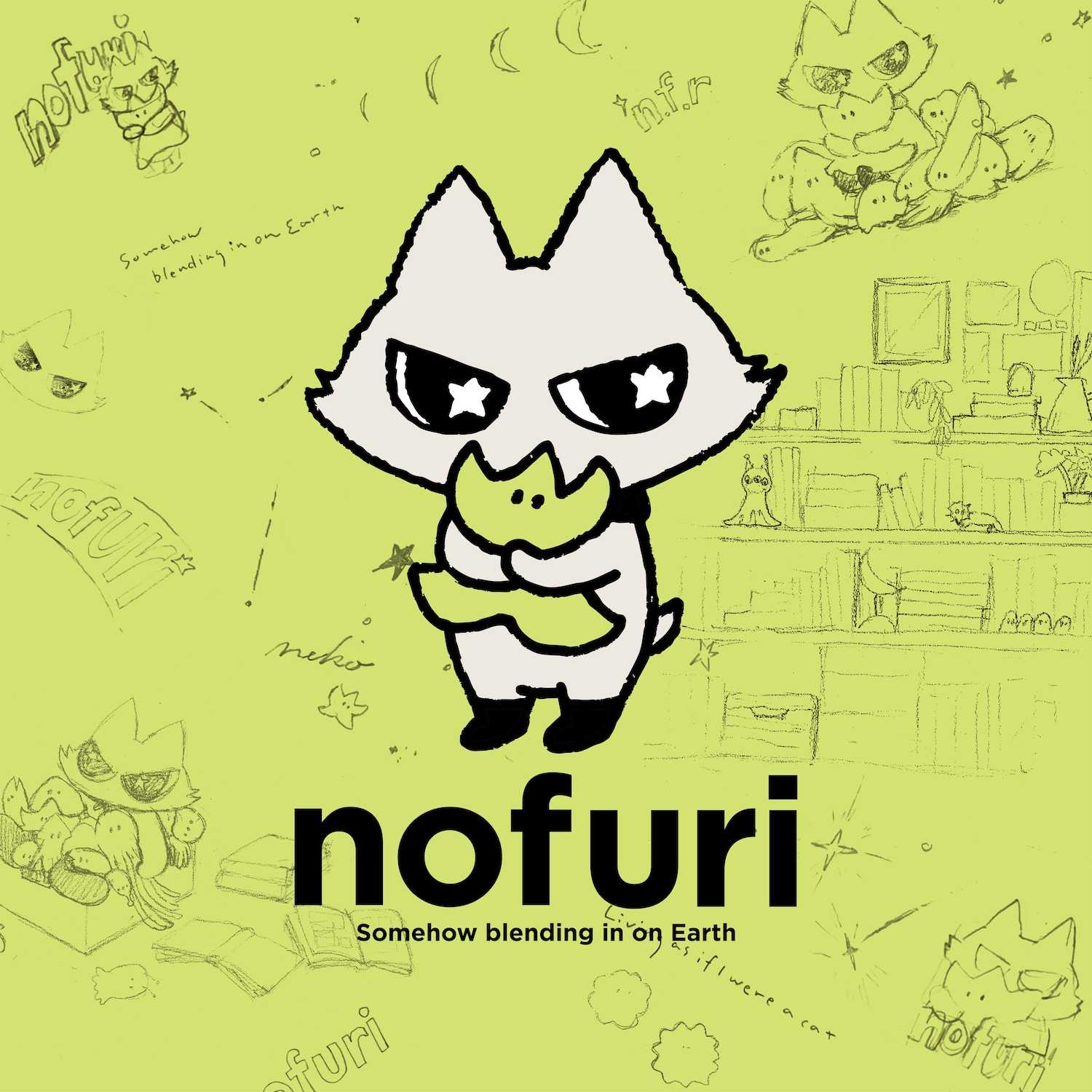 どこかぎこちない表情をしたこの子はノフリ。「ネコのフリ」をして地球の生活に溶け込めるよう「ネコ練習中」。興味があるモノを見つけると、体の色や模様を変えてしまうほど夢中に。そんなふうに自分の“好き”を全身で表現しながら、人間の文化を楽しんでいます。相棒のスターフルーツとともに、これから何に興味を持ってどんな「フリ」をするのでしょう。