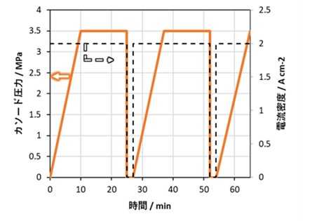 「3.5 MPa差圧 ↔ 常圧」の繰り返し(横軸:時間、左縦軸:圧力、右縦軸:電流密度)