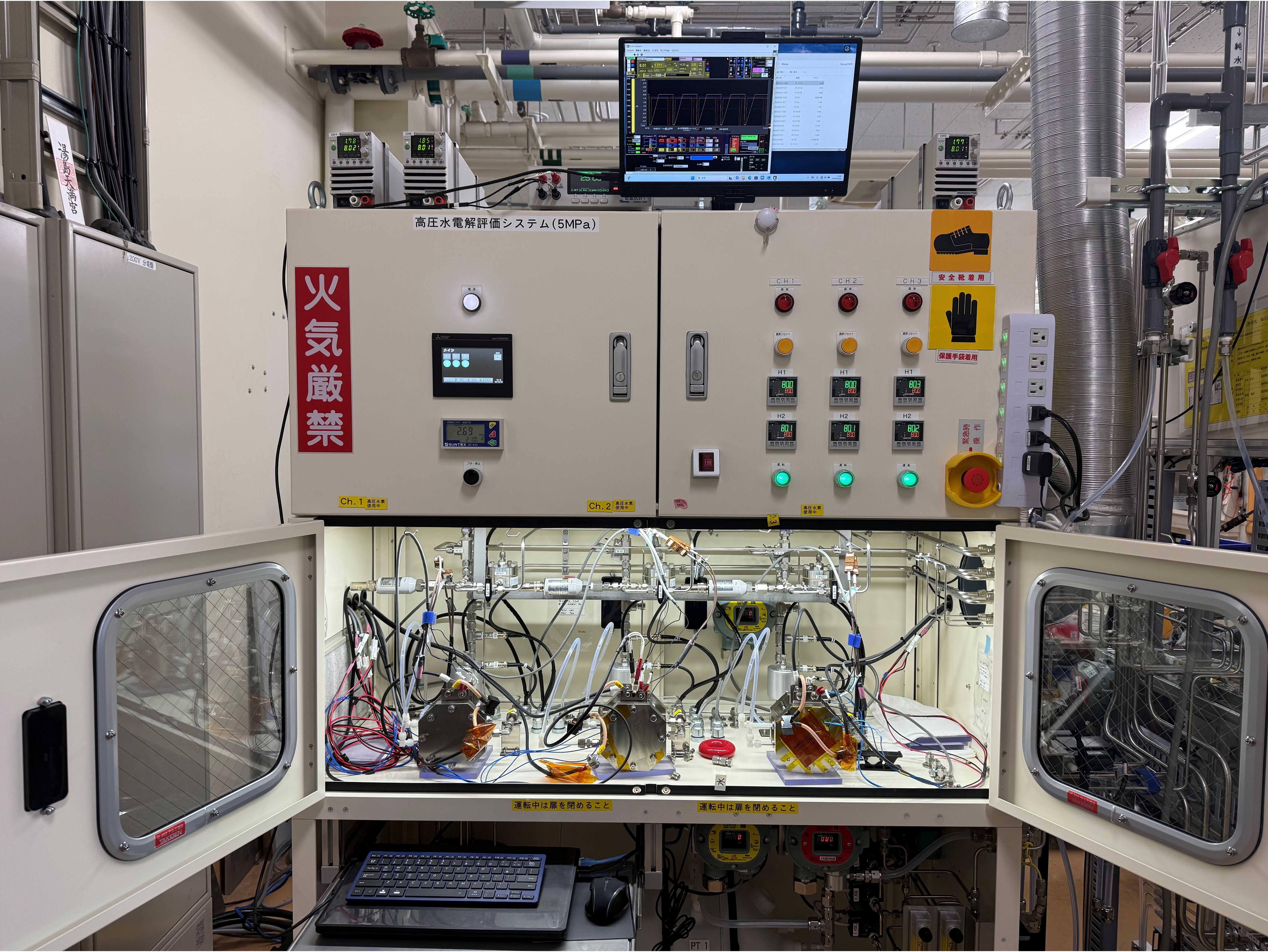 高圧ガス保安法に準拠した高圧水素を製造するPEM水電解評価装置を開発し、
