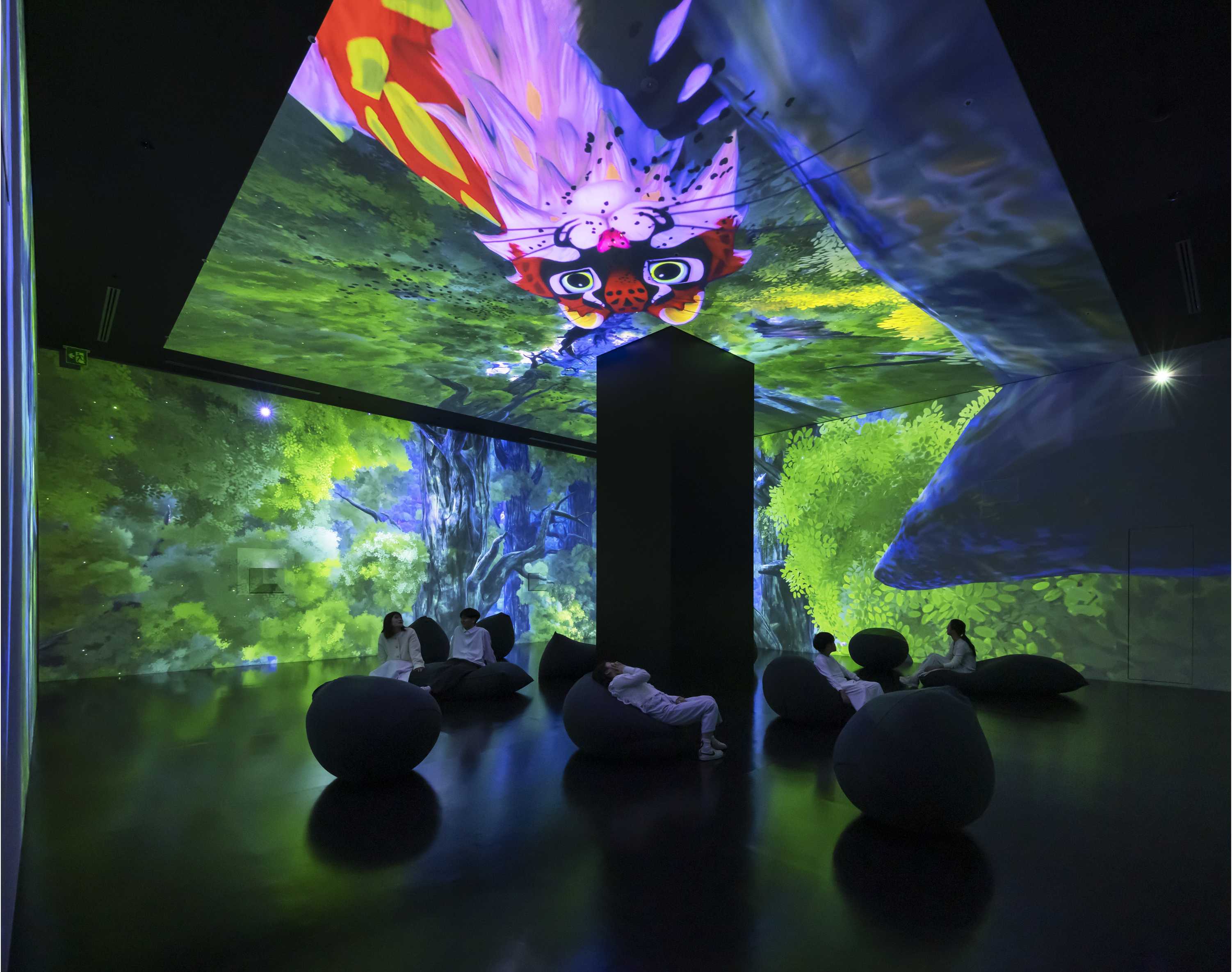 原生林を舞台に、生命がもつ“擬態”をテーマにした体験ゾーン。うっそうとした森から飛び立つチョウの群れや、動き回るヤマネコの視点を追体験し、擬態する生き物たちが生み出す空間の変化を体感できます。壁面と天井に映し出される映像を座って見上げ、ヤマネコの目線で樹の幹を登っていく没入感ある体験が広がります。