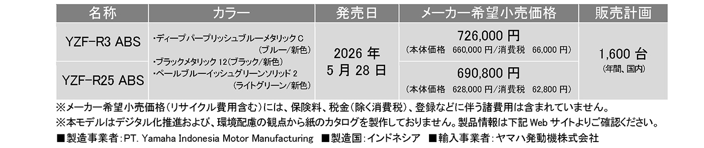 ヤマハ発動機販売株式会社は、スーパースポーツ「YZF-R3 ABS」、「YZF-R25 ABS」のカラーリング3色を刷新し、5月28日に発売します。台数限定にて2月27日より発売の「70th Anniversary Edition」(ホワイト)とあわせ4色展開となります。
