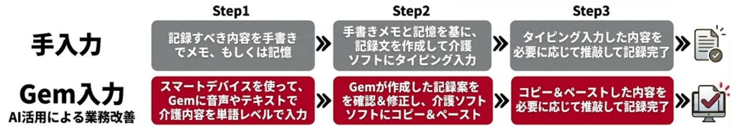 • 教育・指導工数の削減:従来、外国人スタッフが作成した記録の確認・修正に、日本人スタッフの多大な工数を割いていました。Geminiの活用により、外国語での音声入力、単語の羅列や簡潔な入力からでも、文脈に即した正確な日本語の介護専門用語での記述が可能となります。