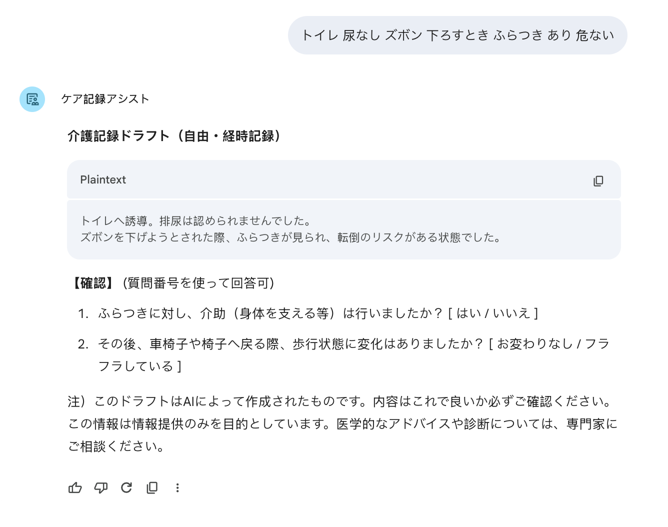 スタッフ入力:「トイレ 尿なし ズボン 下ろすとき ふらつき あり 危ない」