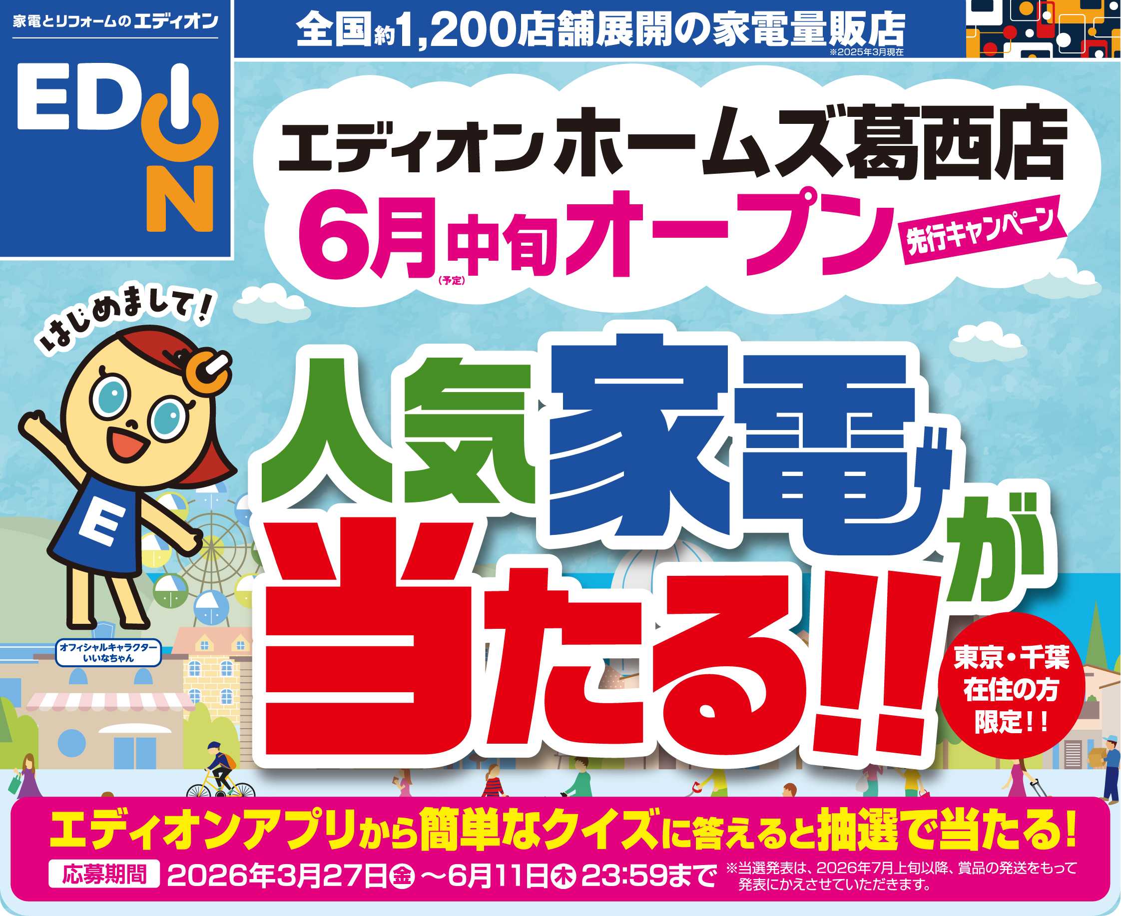 オープンに先立ち、東京・千葉にお住まいの方限定で、話題の家電やギフトカードが抽選で当たる豪華キャンペーンを開催いたします。エディオンアプリで「エディオン ホームズ葛西店」を「My店舗登録」し、簡単なクイズにお答えいただくだけでご応募いただけます。