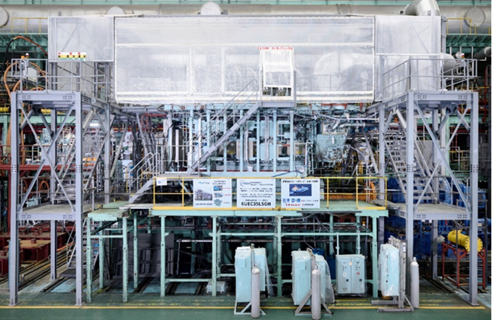 本プロジェクトにおいて、ジャパンエンジンは水素を燃料とする純国産大型低速2ストロークエンジンの開発に取り組んでおり、この度、世界で初めて(註2※)フルスケールエンジン初号機(実際の船舶に搭載するエンジン、6UEC35LSGH)での全筒水素燃料混焼運転を開始いたしました。現在までに、100%負荷で水素混焼率95%以上に到達しており、GHG削減と安定運転を確認しております。今後も水素混焼運転における性能最適化のための検証試験を継続いたします。