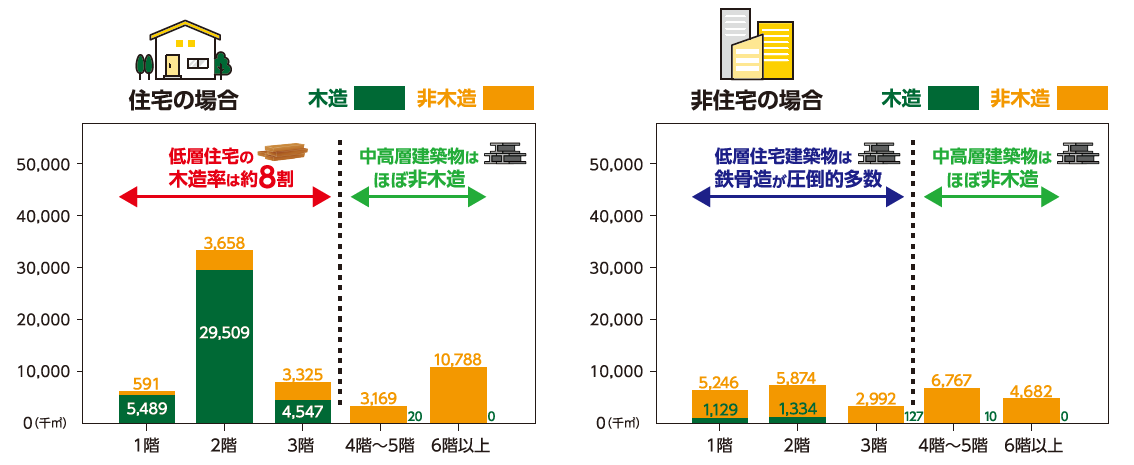 「1階から3階の低層非住宅」の木造率は約7%に留まっており、木造建築に携わる地域工務店にとっては大きなチャンスとなります。「1階から3階の低層非住宅・非木造」は合計約14,112,000㎡。㎡単価48万円とすると約7兆円規模のブルーオーシャンが創出されます。