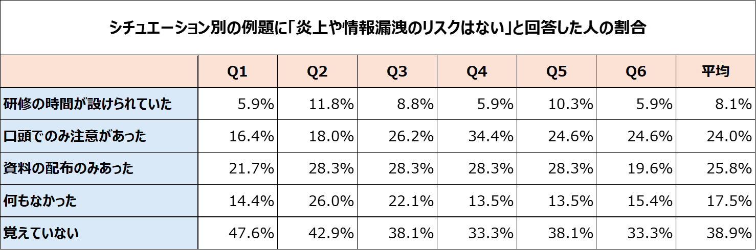SNSの炎上や情報漏洩に対する危機意識を測るため、6つの具体的なリスクシチュエーションを例示し、リスク認識を調査しました。その結果、すべてのシチュエーションで平均20%前後の人が「炎上や情報漏洩の可能性はない」と回答しています。