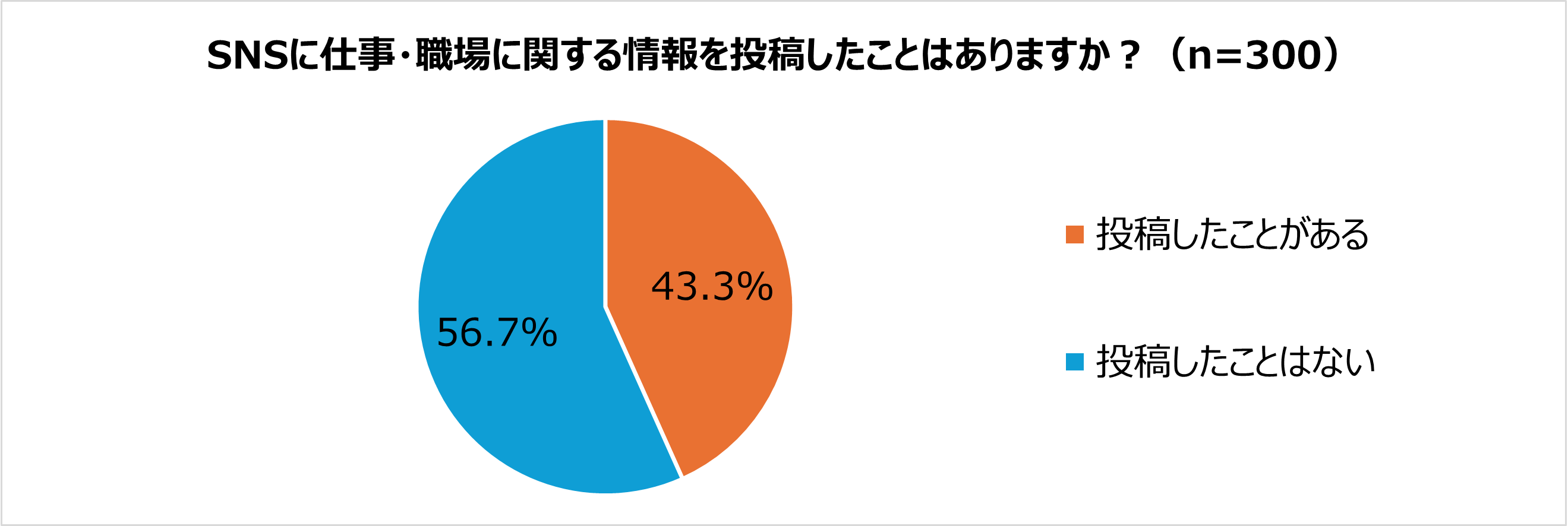 SNSに仕事・職場に関する情報を投稿したことがあるかを問う質問では、43.3%(130名)が仕事・職場に関する情報を投稿した経験があると回答しています。