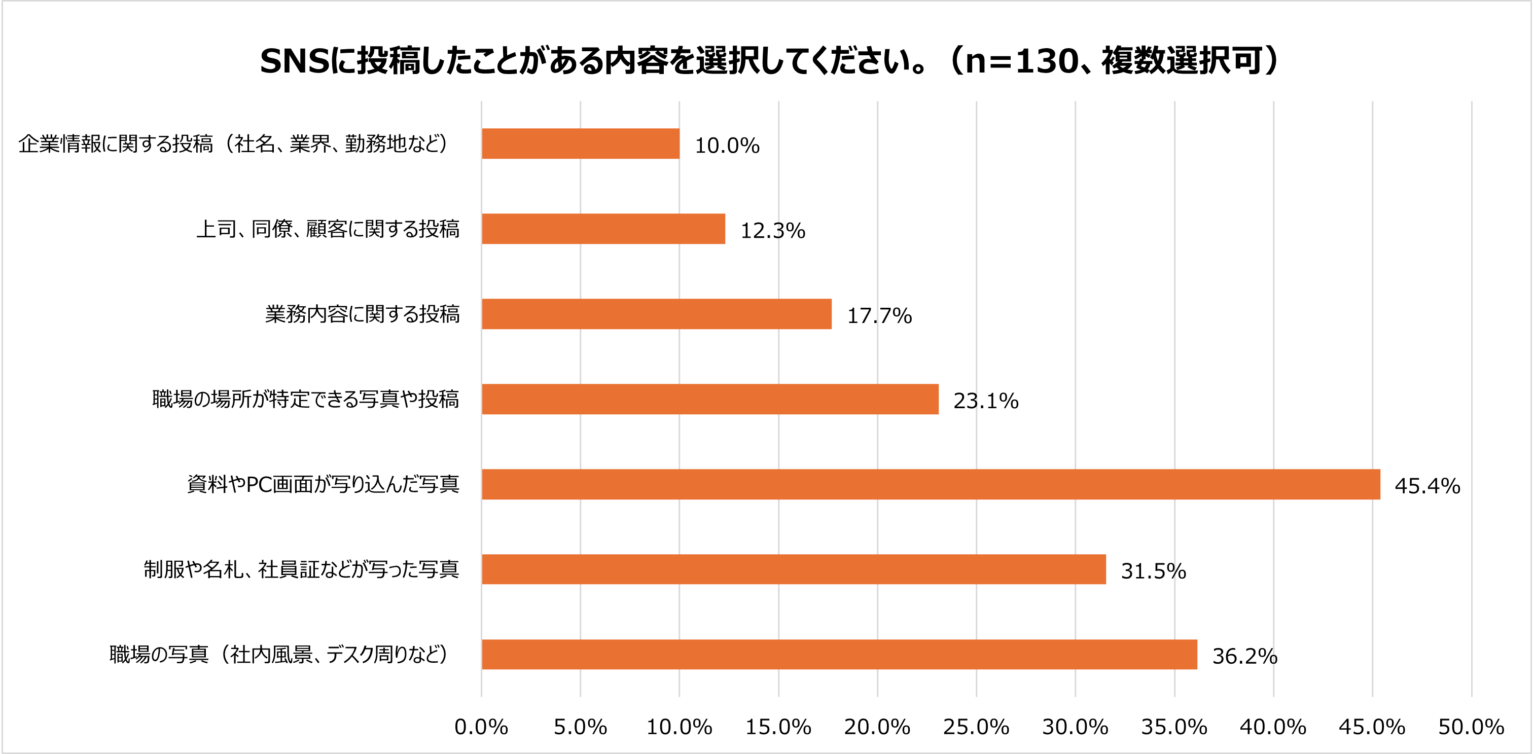 「ある」と回答した人の内訳としては、「資料やPC画面が写り込んだ写真」が45.4%で最多となりました。