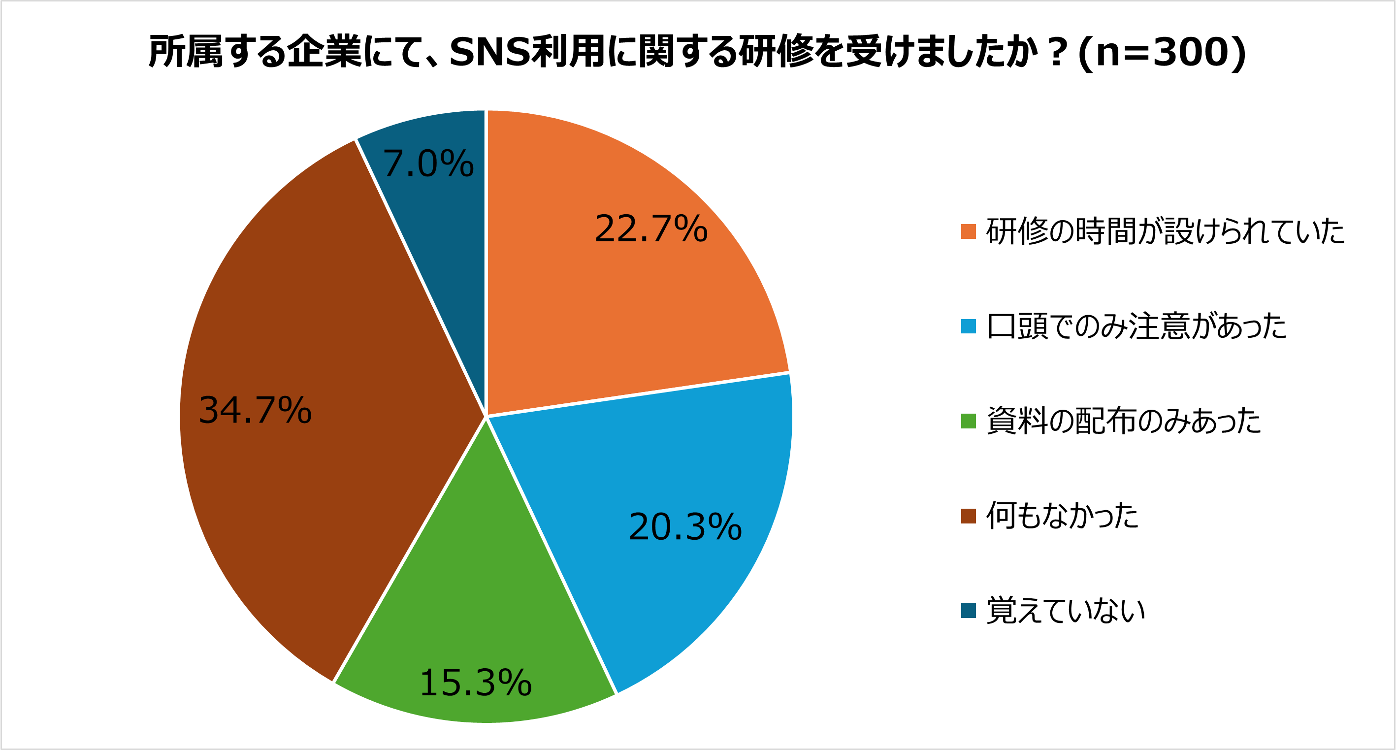 「所属する企業にて、SNS利用に関する研修を受けましたか?」という質問に対して「研修の時間が設けられていた」と回答した人は22.7%にとどまりました。ただし、「口頭でのみ注意があった」「資料の配布のみあった」の回答と合わせると合計は58.3%となりました。