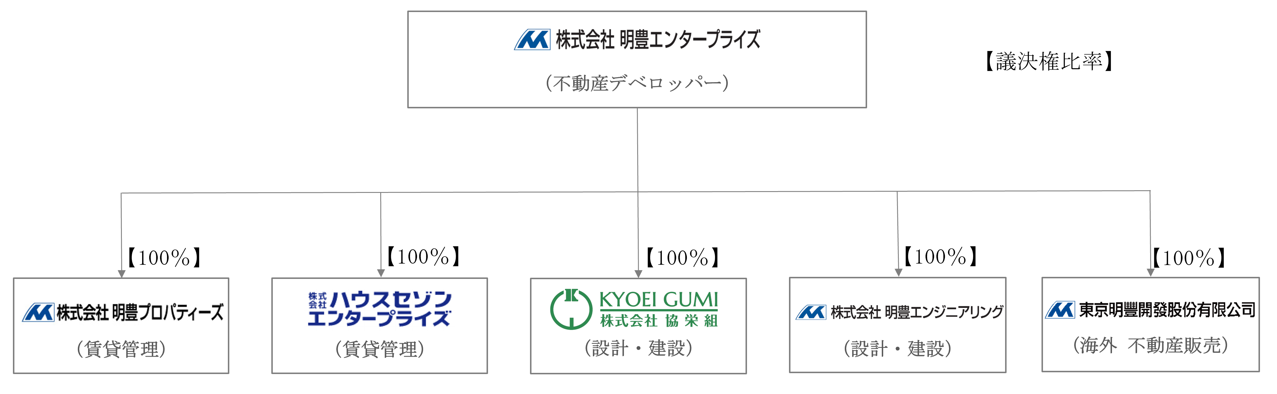 創業57年、物造りにこだわった信頼と実績の東証上場デベロッパーとして、東京23区を中心に250棟を超える“新築1棟投資用賃貸住宅”を供給している株式会社明豊エンタープライズ(東京都目黒区:代表取締役会長 矢吹 満)を親会社とし、賃貸管理会社の株式会社明豊プロパティーズ(東京都目黒区:代表取締役社長 竹内 智大)、株式会社ハウスセゾンエンタープライズ(京都府京都市:代表取締役社長 奥山 秀昭)、建設会社の株式会社明豊エンジニアリング(東京都目黒区:代表取締役社長 阪本 伸司)、株式会社協栄組(東京都世田谷区:取締役社長 徳満 亮輔)、海外現地法人の東京明豐開發股份有限公司(本社 台北市中山区:代表取締役社長 内田千博)で構成されております。
