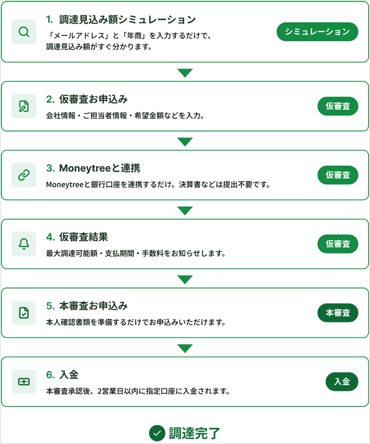 将来売上を前払いする中小企業向けの資金調達サービスです。申込みから資金提供まで、すべてオンラインで完結し、AI審査により最短4営業日で最大1億円の買取が完了します。一般的な銀行融資と比べて、より短い期間で簡単に資金を調達できる点が特長です。また、決算書・担保・保証人などは不要なため、手続きや心理的な負担を抑えながら、"サクっと"資金調達をご利用いただけます。