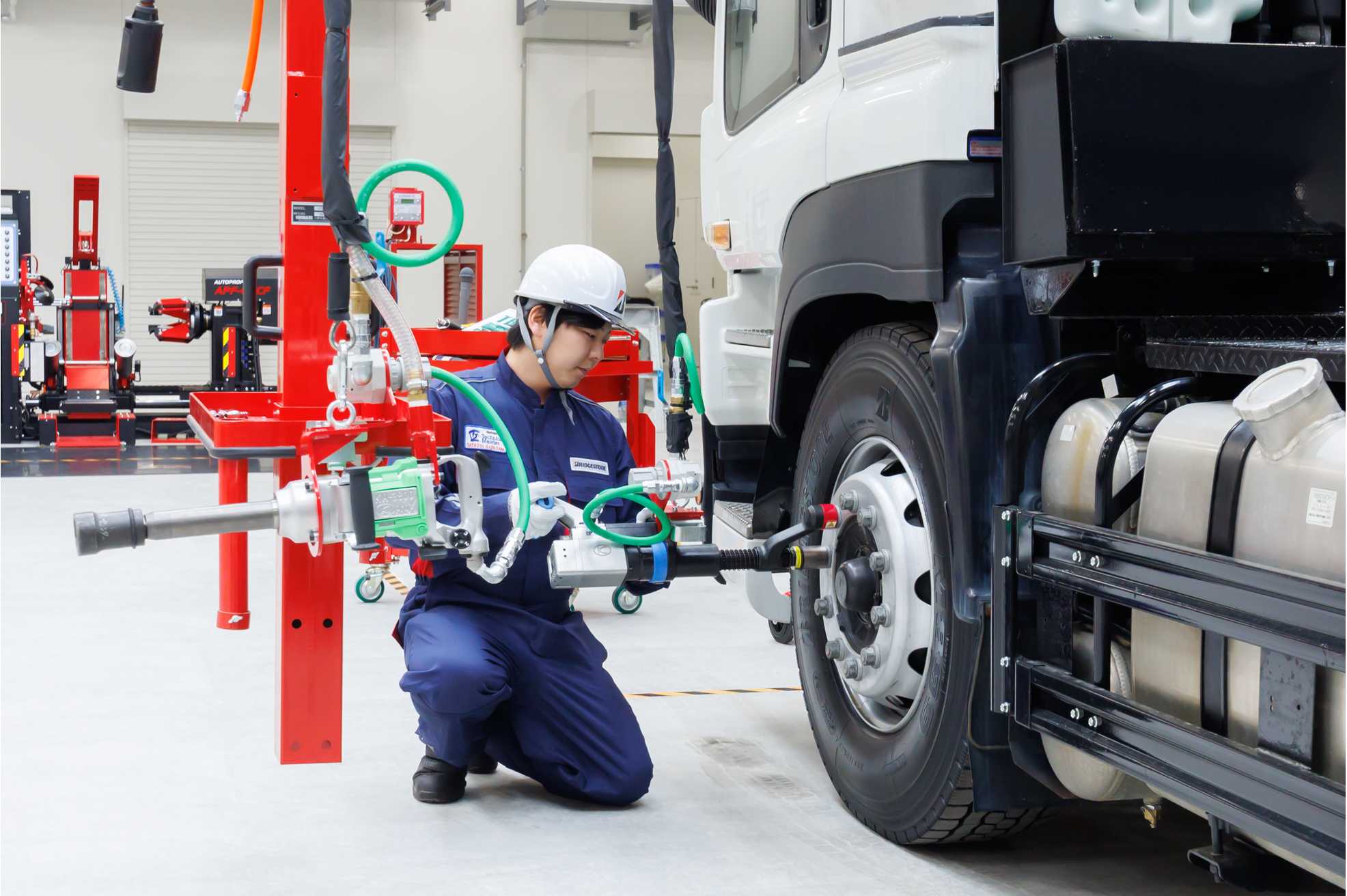 トラック・バスなど大型車のタイヤ交換の際に、作業者がボルトとナットを規定のトルクで締め付けられているか確認できる軸力計を備えています。また、全国ネットワークで24時間対応のロードサービス「ブリヂストン サービスネットワーク(BSN)」のサービス向上を目的として高速道路の路面を再現した出張サービス研修路を備え、パンク状態からのジャッキアップやスペアタイヤへの交換など、危険の多い高速道路上での安全・適切な作業を習得できます。