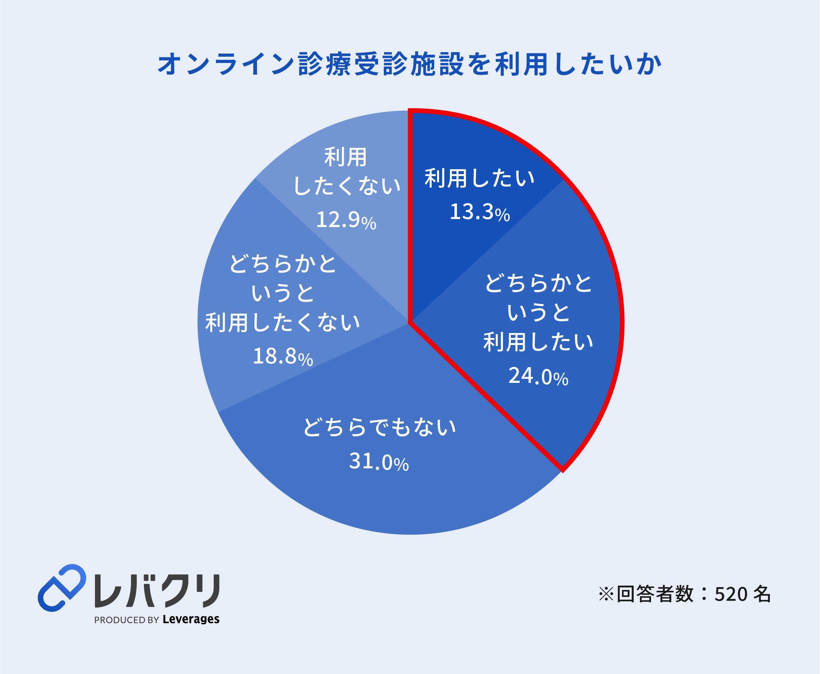 レバレジーズ株式会社が運営するオンライン診療プラットフォーム「レバクリ」(https://levcli.jp/)は、直近1年以内に対面にて病院受診の経験がある520名を対象に、オンライン診療の利用意向に関する調査を実施しました。