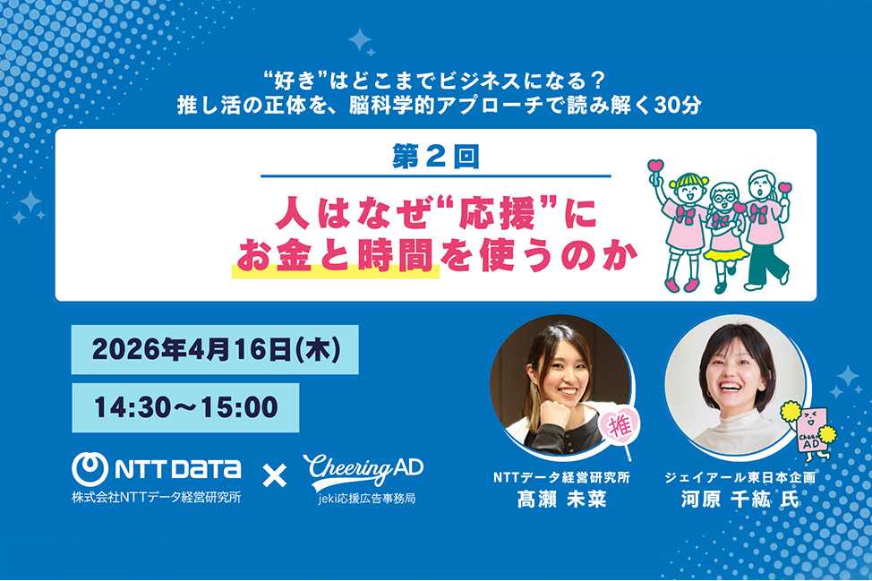 本セミナーは、ジェイアール東日本企画で駅の応援広告など「応援」や「関与」が生まれる現場を見てきた河原千紘氏と、脳科学・心理学の視点から人の行動を分析する髙瀨未菜による全3回共通の対談シリーズです。