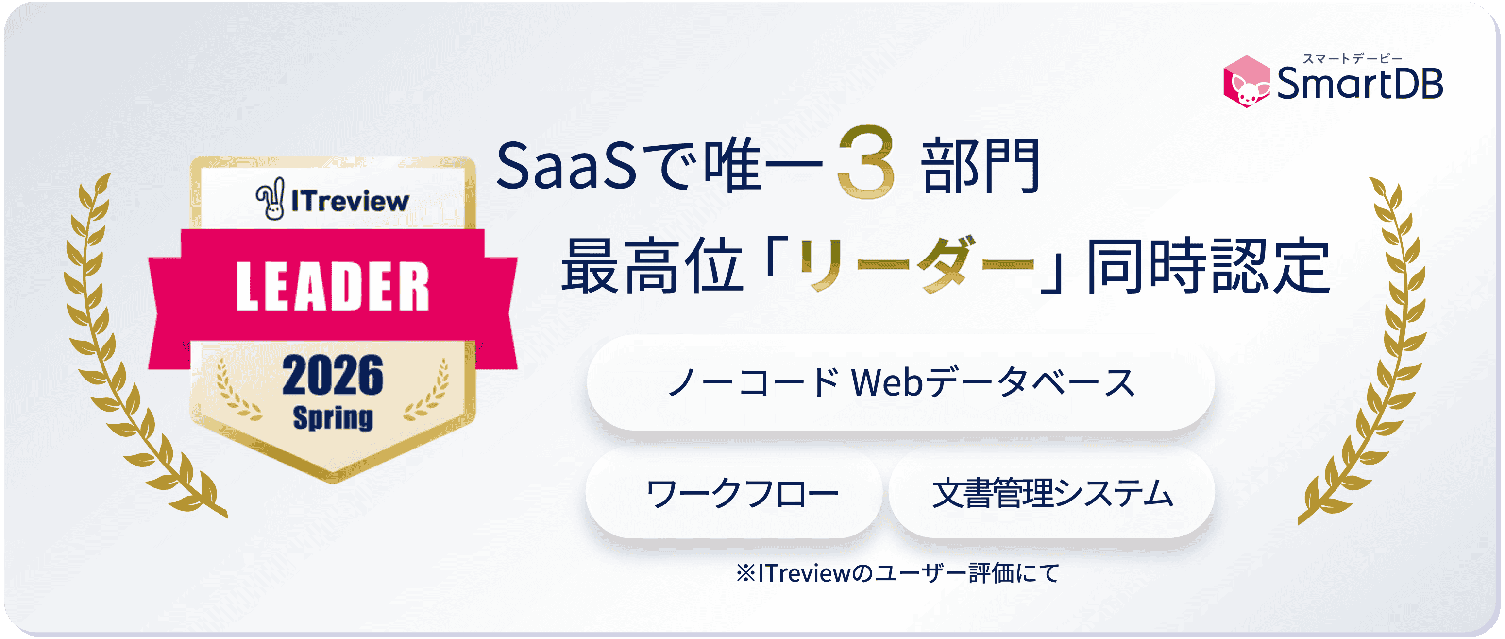 SmartDB(R)(スマートデービー)」が、アイティクラウド株式会社(本社:東京都港区、代表取締役社長:黒野 源太)が運営するIT製品レビュープラットフォーム「ITreview(アイティレビュー)」で発表された「ITreview Grid Award 2026 Spring」においてSaaSで唯一、最高位の「Leader」に3部門で16期連続同時認定されたことをお知らせします。