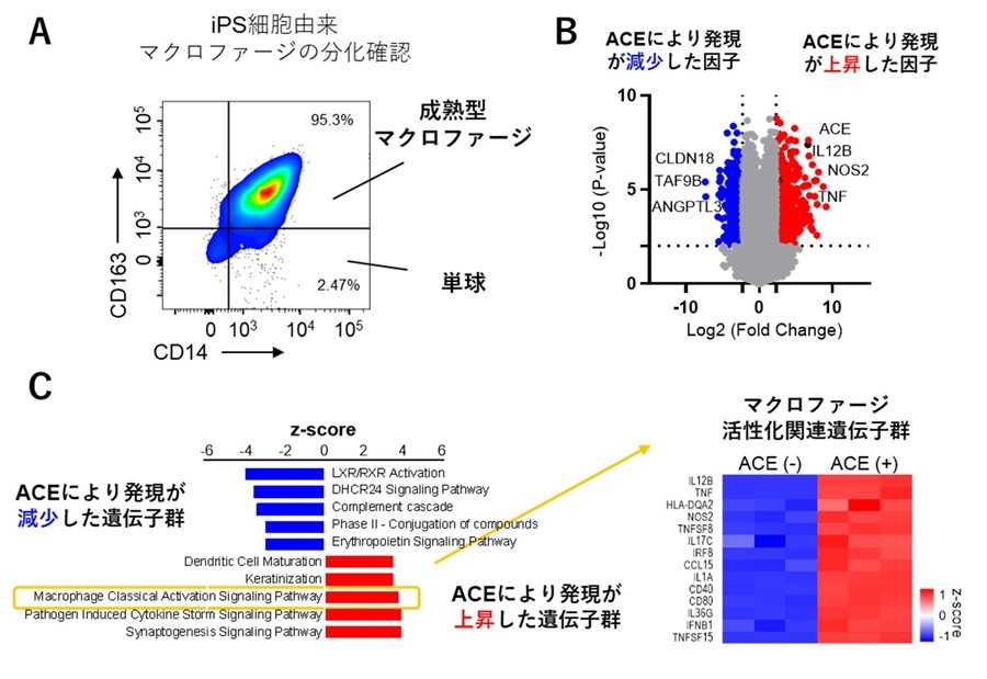 研究グループは、Tet-On誘導システムを用いて、抗生物質ドキシサイクリン(Dox)の投与によりACE発現を誘導できるヒトiPS細胞株を樹立しました。さらに、iPS細胞から効率よく成熟型マクロファージを得る分化プロトコールを確立しました(図1A)。この細胞株と分化系を用いて、以下の点を明らかにしました。