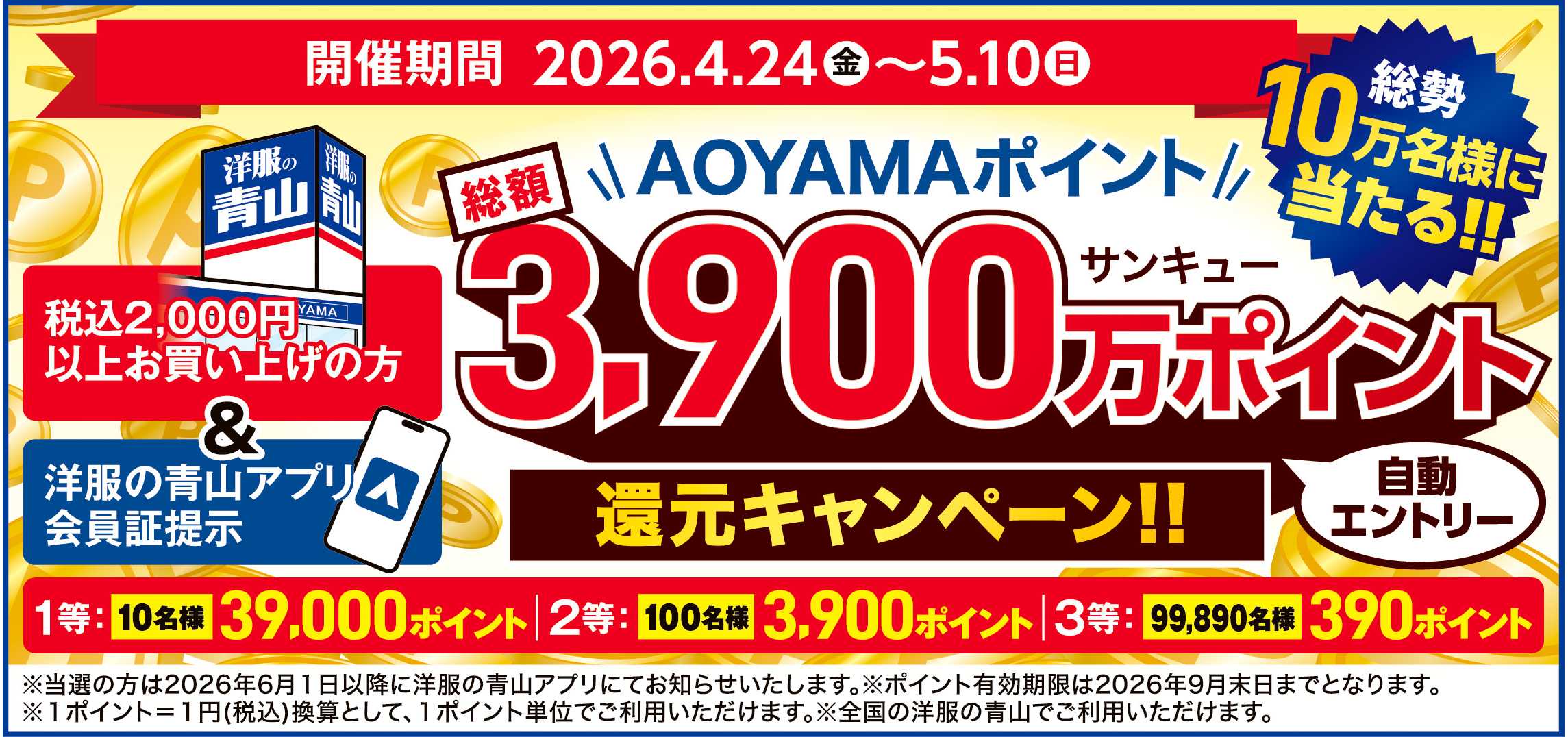 総額3,900万ポイントが、総勢10万名さまに当たる