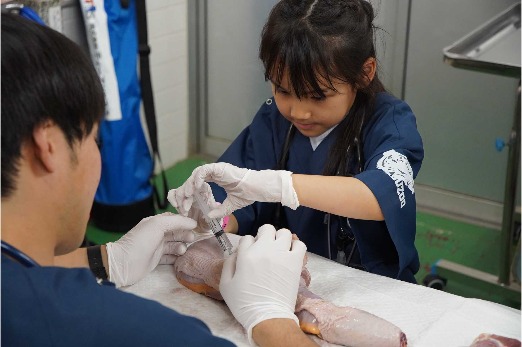 今回、夢を叶えたのは須藤すみれさん(8歳)。当園の獣医師による直接指導のもと、普段は立ち入ることのできない「獣医室」の見学や、実際の日常業務で使用する機器を用いた注射体験、エコー(超音波診断)体験に挑戦しました。