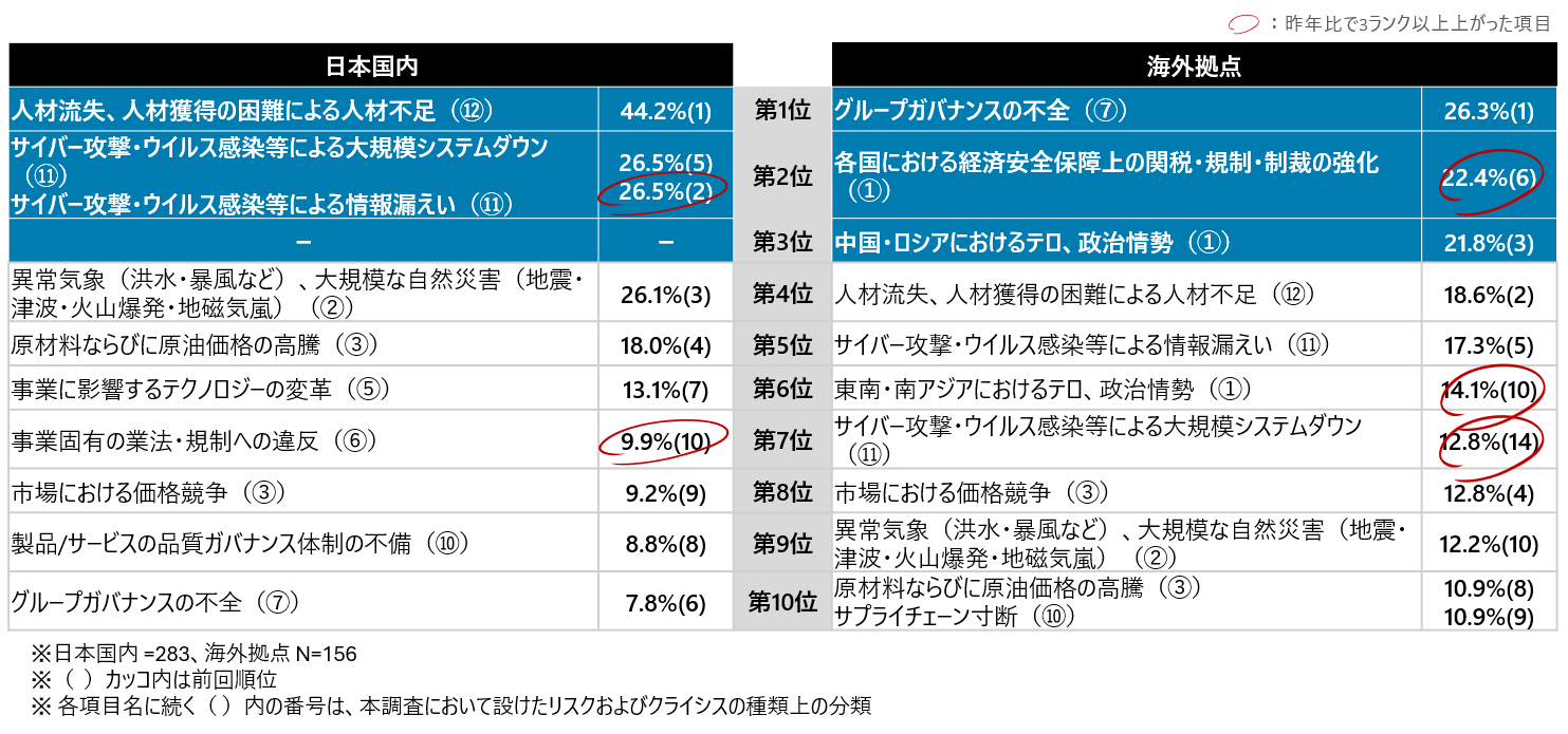 引き続き国内外問わずガバナンス・コンプライアンス関連リスクが上位となり、海外拠点において地政学リスクに関連したリスクも上昇