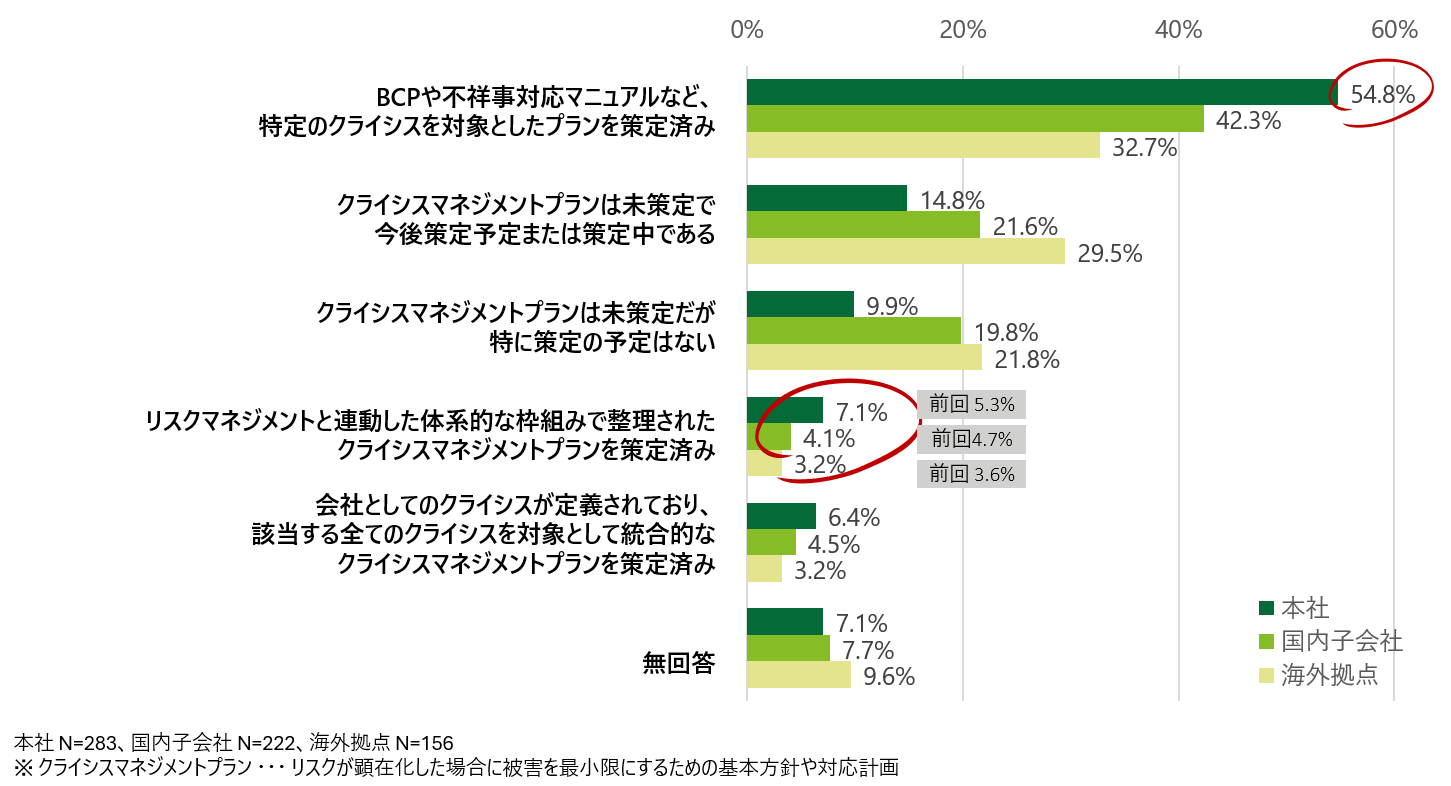 本社、国内子会社、海外拠点別に見たクライシスマネジメントプランの策定状況では、「BCPや不祥事対応マニュアルなど、特定のクライシスを対象としたプランを策定済み」と答えた企業は本社で54.8%と、約半数の企業が対応していることがわかりました(図表2)。一方で「リスクマネジメントと連動した体系的な枠組みで整理されたクライシスマネジメントプランを策定済み」と答えた企業は本社では7.1%(前回5.3%)、国内子会社4.1%(前回4.7%)、海外拠点3.2%(前回3.6%)と前回から微増も、依然低い結果となりました。近年の自然災害の発生、感染症の流行、紛争問題の発生、品質を含めたコンプライアンス違反の発生なども踏まえ、非常事態に陥った際に、円滑な平常時への復旧を実現するためにも、クライシスに係るプラン策定に加え、リスクマネジメントと連動したプラン策定の検討も多くの企業で推進する必要があります。