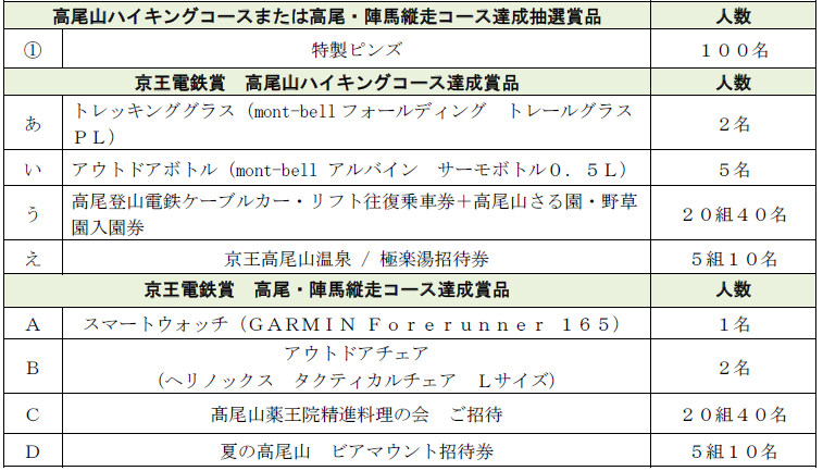高尾山ハイキングコース、または高尾・陣馬縦走コース達成で特製ピンズに応募できます。さらにそれぞれのコースを達成すると、対象コースの京王電鉄賞に応募もできます。