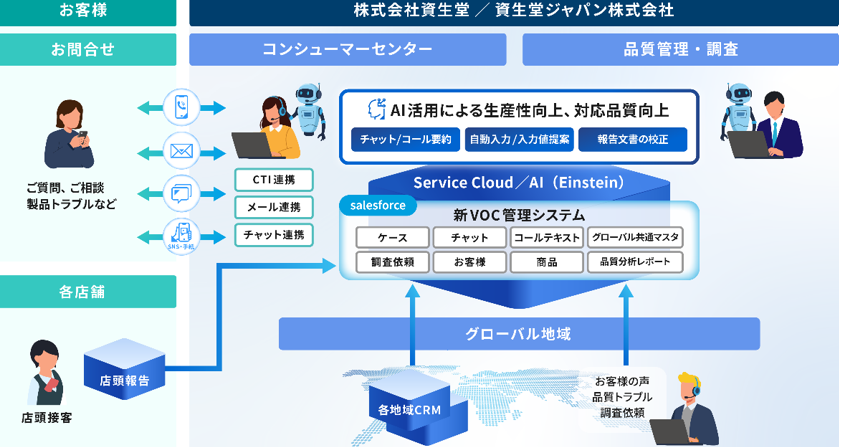 Salesforce Service Cloud/Einsteinと、当社の専門知識および高度な技術力を活用することで、資生堂の高品質なお客様対応を支援し、グローバルな視点での品質向上を支える新たなVOC管理システムを構築しました。