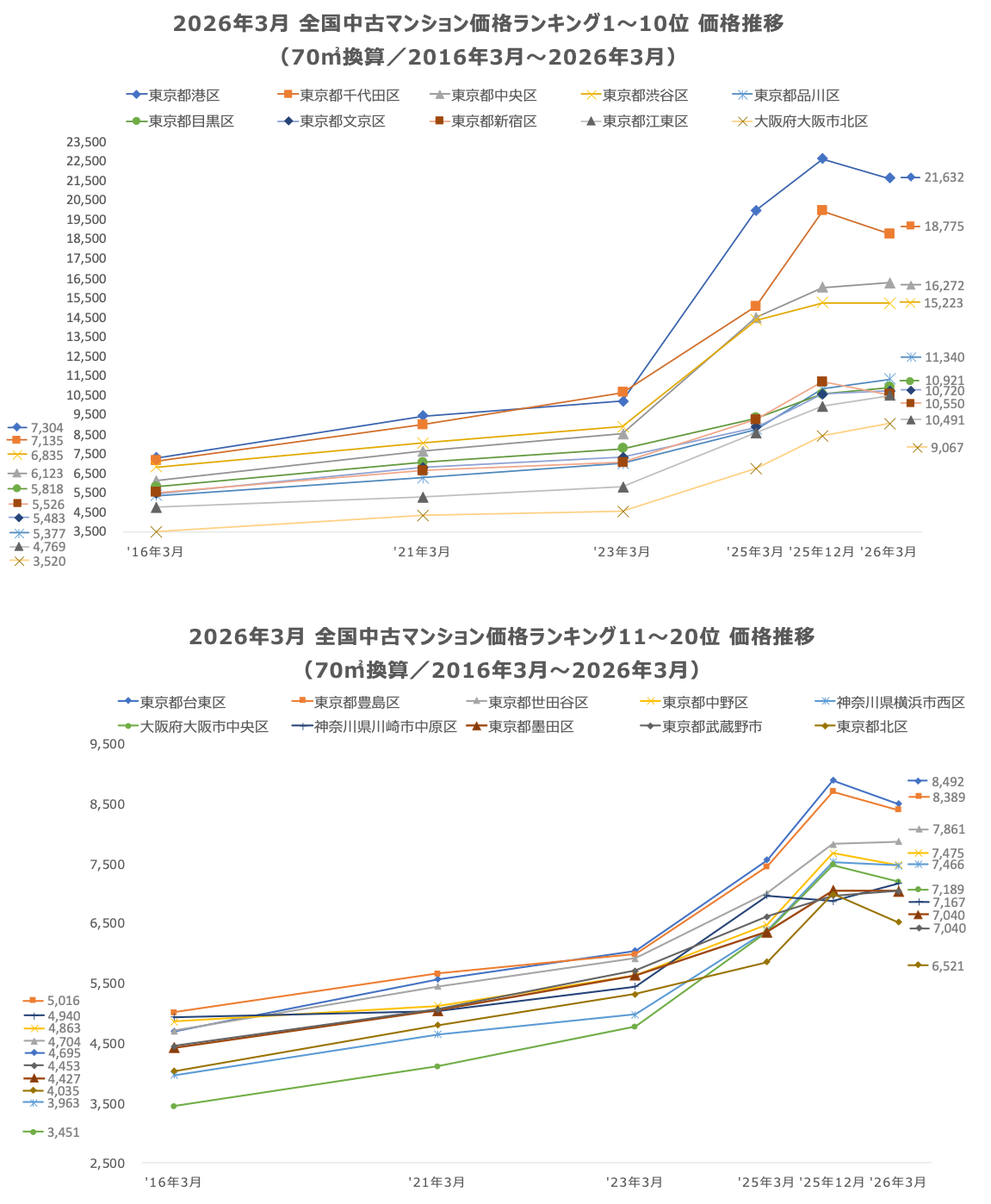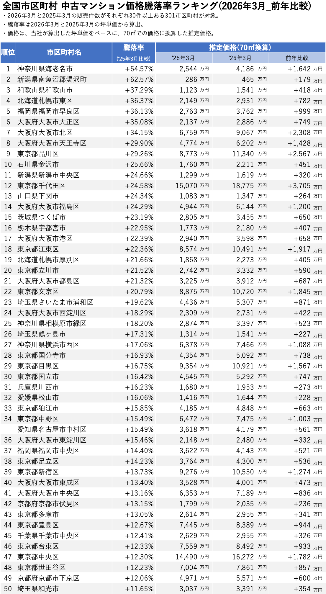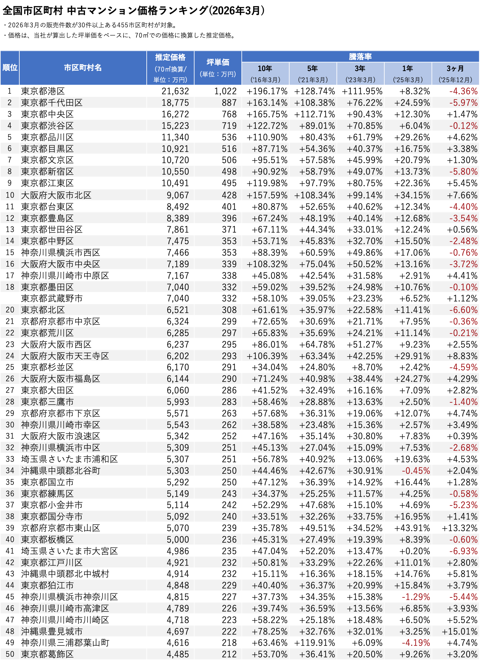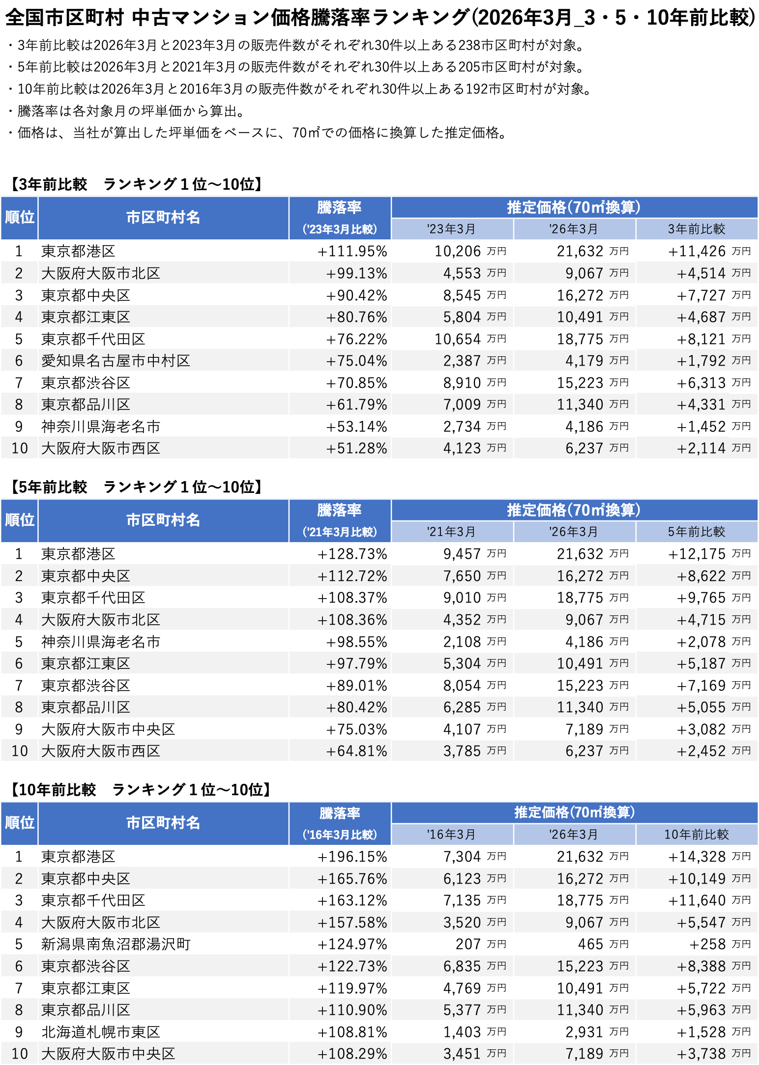 「不動産×WEB×ビッグデータ」の領域で、さまざまな不動産テックサービスを展開する株式会社ワンノブアカインド(本社:東京都港区、代表取締役社長:川島 直也、以下当社)は、当社が運営するマンション情報サイト「マンションレビュー」の保有データを元に、2026年3月の全国市区町村における中古マンションの相場を調査。坪単価をベースに70㎡の価格に換算した「中古マンション価格」*1と価格ランキング上位20件について過去10年間の価格推移、および1年前からの価格上昇率を表す「騰落率」のランキングを発表いたします。