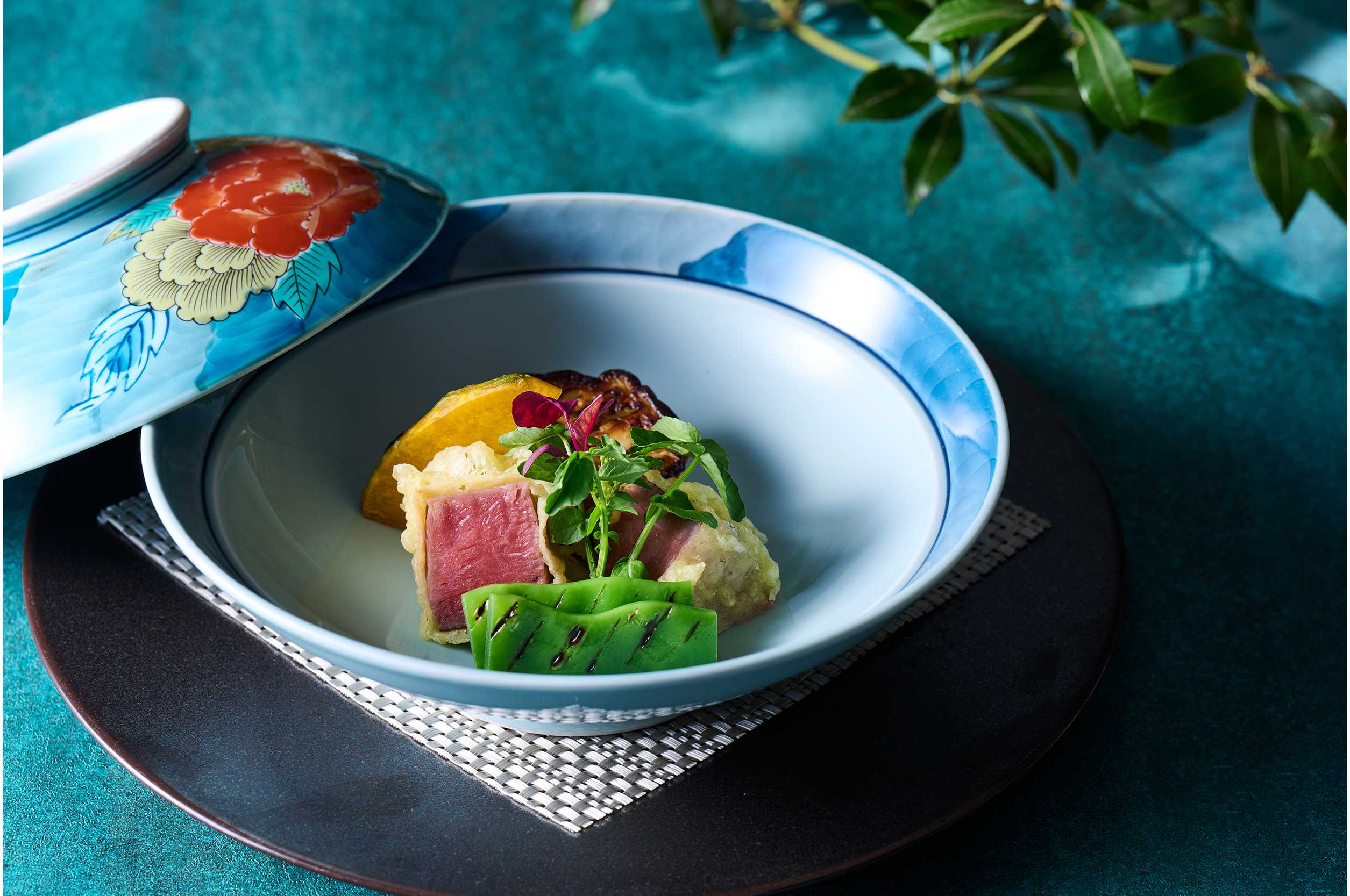 本コースは、伊豆近海の魚介や三島産野菜などの地元食材を中心とし、冷製や温製を織り交ぜ、夏の食欲低下に向き合い、「涼」「彩」「驚」を軸に一皿ごとの設計を行いました。前菜では夏野菜のゼリー寄せや蒸し鶏と白瓜の梅肉和えが涼やかな酸味を添え、とうもろこし真丈やあわび酒蒸しによる穏やかな旨味の重なりを表現。渡り蟹の茶碗蒸しは、やさしい温度と香りで次の一皿へと導きます。魚料理には鱸のローストと平貝のグリルに三島産完熟トマトを合わせ、サフランの香りと山葵のアクセントによる夏らしい余韻を演出。肉料理では牛ヒレを天婦羅仕立てにし、軽やかな衣と炭火の香り、青柚子の爽やかさが印象を際立たせます。締めには、薬味を添えた鯵に温かい出汁をかけるまご茶漬けをご用意し、涼と温の対比で穏やかな満足感をご堪能いただけます。