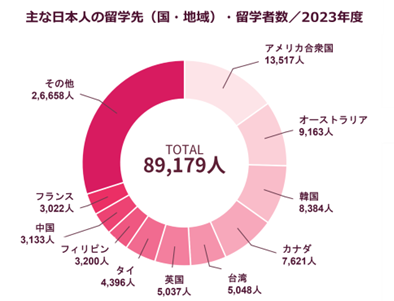 日韓のビジネス交流や語学留学の両面で、日本人の渡韓需要はかつてない高まりを見せています。文部科学省および独立行政法人日本学生支援機構(JASSO)の最新調査※1によれば、日本人学生の海外留学者数は年間89,179人に達し、国別の留学先としてアメリカ、オーストラリアに次ぎ、韓国は第3位にランクインしました。英語圏以外では最多の留学者数を誇り、特に1か月未満の短期留学が対前年度比で約2倍になるなど、渡韓の目的やスタイルは多様化し続けています。