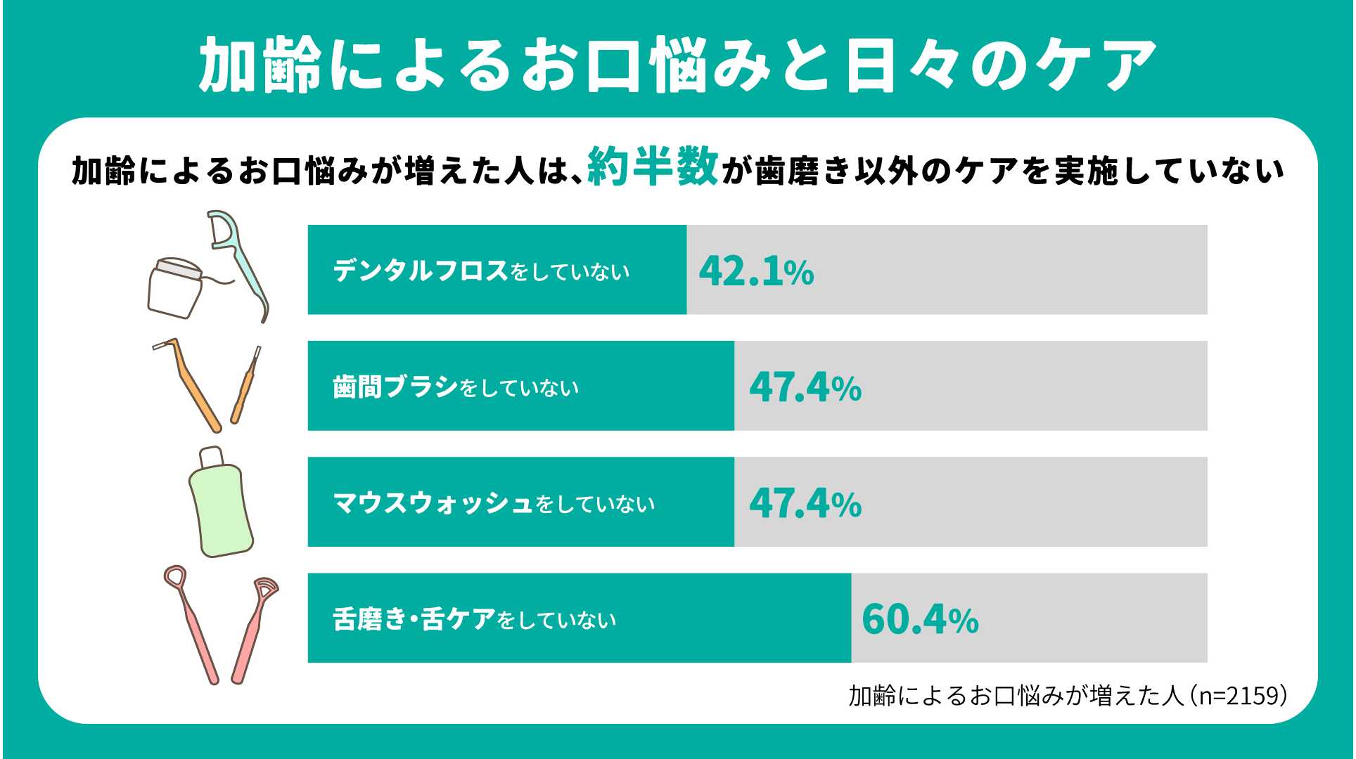 ③加齢によるお口の悩みが増えた人は、日々の口内対策を怠っていることが判明。肌と同じように、トラブルを感じる前からの「お口年齢ケア」が重要。