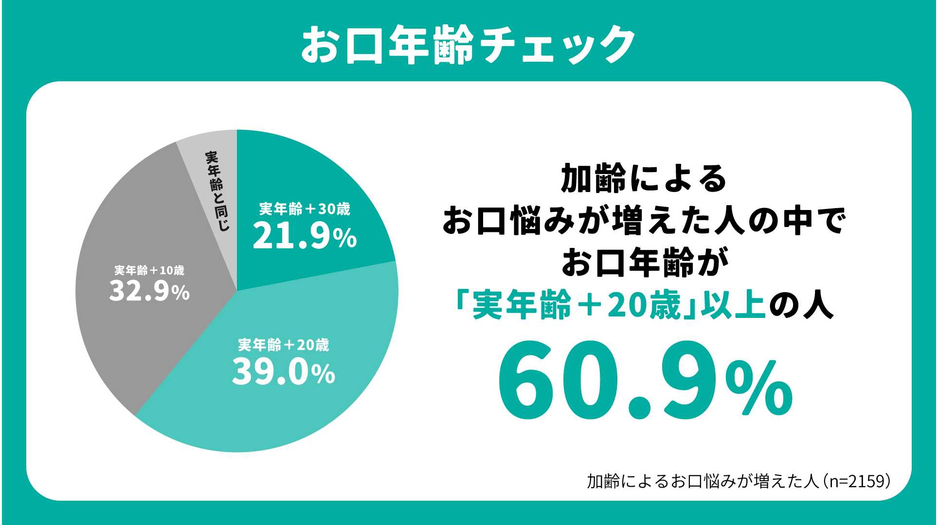 実際に、加齢によるお口の悩みが増えている人は約6割に上ります。加齢によるお口悩みのある人の、約半数の人は、洗口液などのプラスアルファの対策が不十分であることが判明。その結果、お口年齢が「実年齢+20歳」以上(※2)の方は約6割を占めており、加齢によるお口環境の悪化が顕著に表れています。特に春先はストレス、生活リズムの乱れが重なることで、炎症老化が加速しやすい時期です。この時期のケア習慣が、その後のお口の健康状態に影響を与える可能性が考えられます。