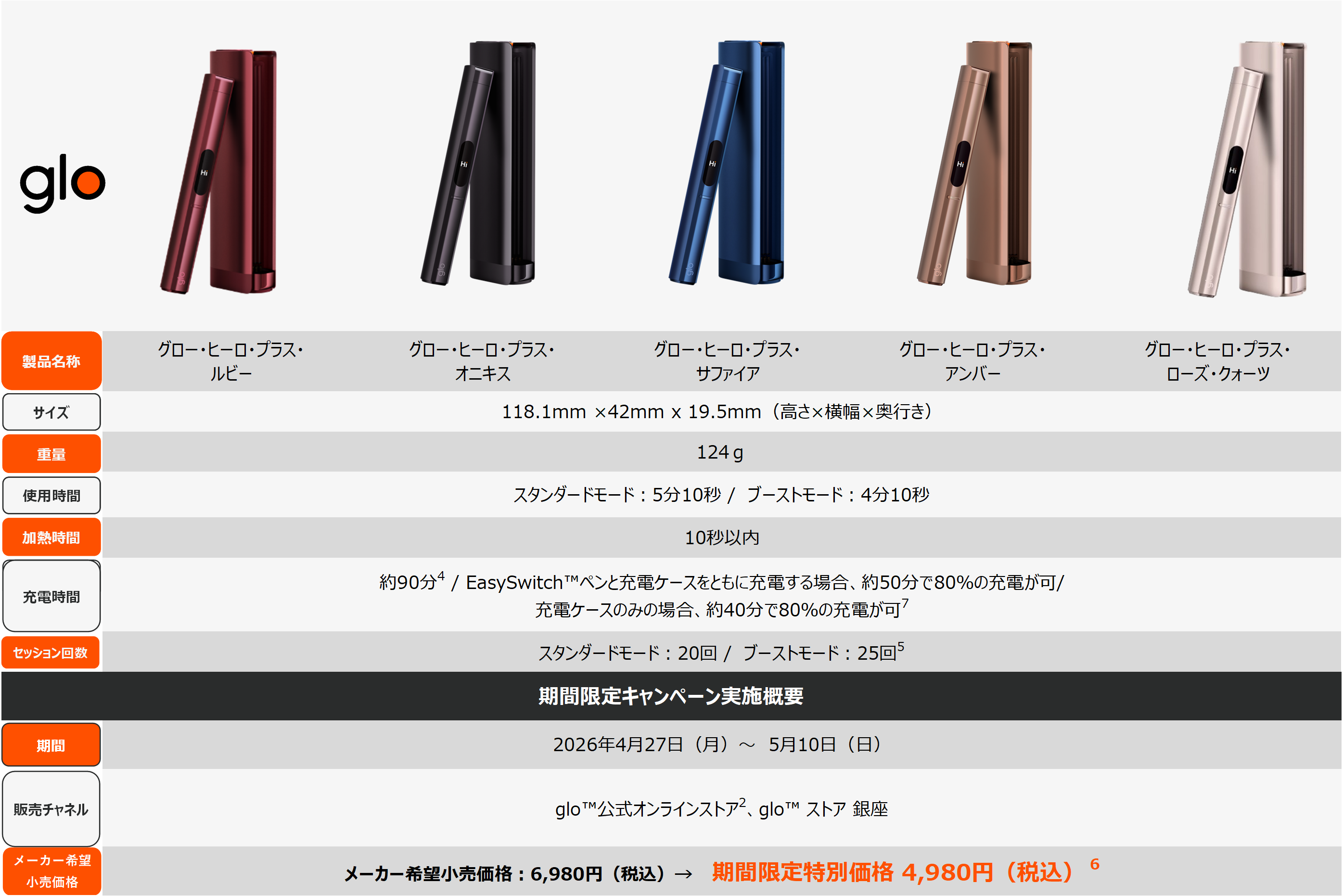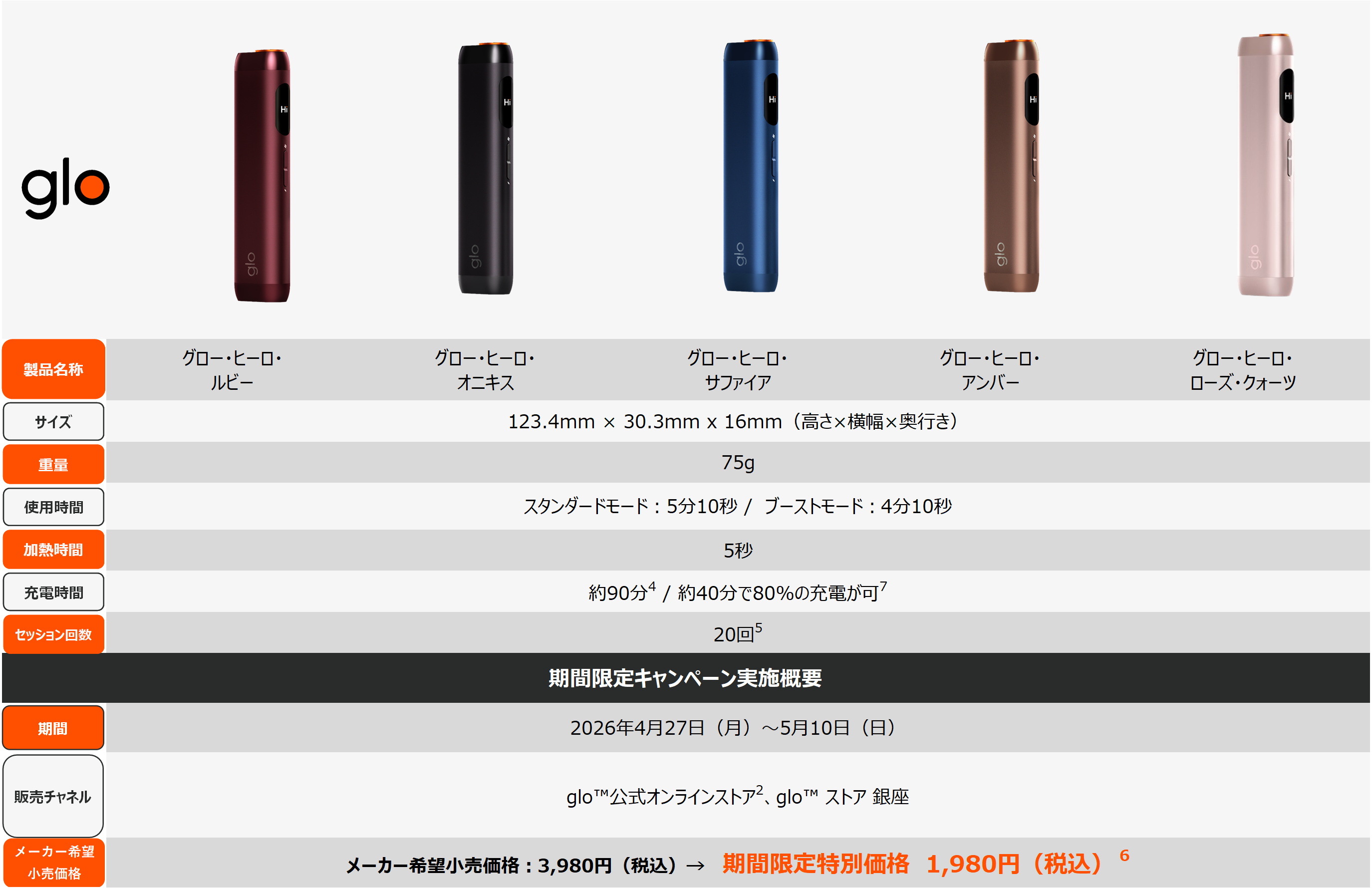 また、「glo™ Hilo(グロー・ヒーロ)」および「glo™ Hilo Plus(グロー・ヒーロ・プラス)」も2026年4月27日(月)から5月10日(日)までの期間、glo™公式オンラインストアおよび各公式オンラインストア[2]、ならびにglo™ ストア 銀座にてデバイスの全カラーを対象にメーカー希望小売価格から2,000円オフで販売いたします。