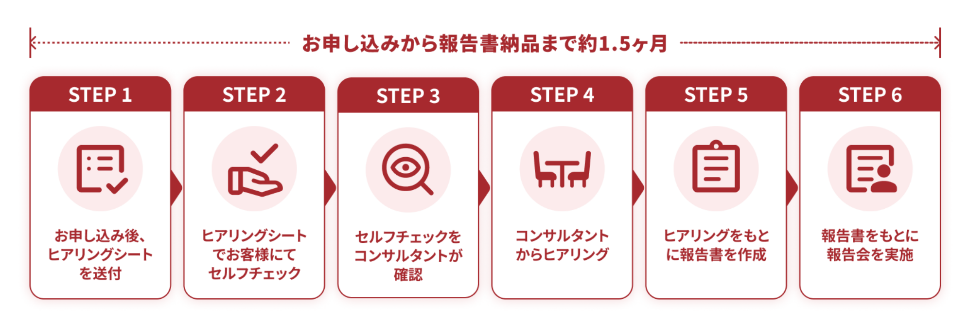 ヒアリングシートの回答内容をもとに、コンサルタントがヒアリングを実施し、現状分析結果をアセスメント報告書として提示します。また、評価基準への適合に向けた対応方針・改善案についてもあわせて提示します。