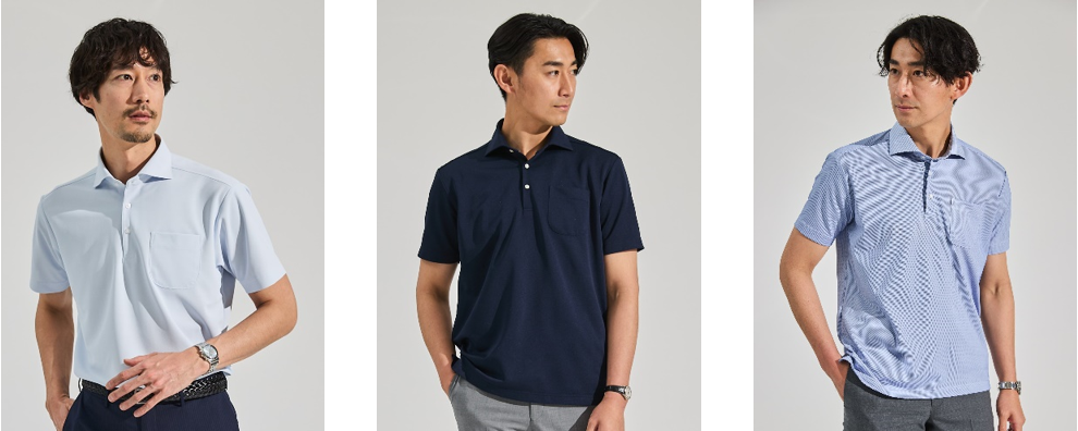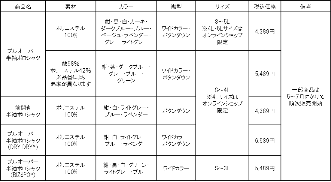 今季は吸水速乾性、汗ジミ軽減、透け防止といった機能性に特化した「ビズポロ 『DRY DRY®』」が新たに登場。従来のビズポロの特長を備えつつ、肌離れがよくさらっとした着心地で汗ジミが目立ちにくいことに加え、透けも防ぐことができる万能アイテムです。また、アクティブなシーンでも活躍する高いストレッチ性が魅力の「BIZSPO®」ラインはカラーと素材の展開を拡充。従来のビズポロについても、一部商品をオンライン限定にて5Lサイズを新規に展開し、より多くのお客様のニーズに対応できるようラインナップを揃えました。