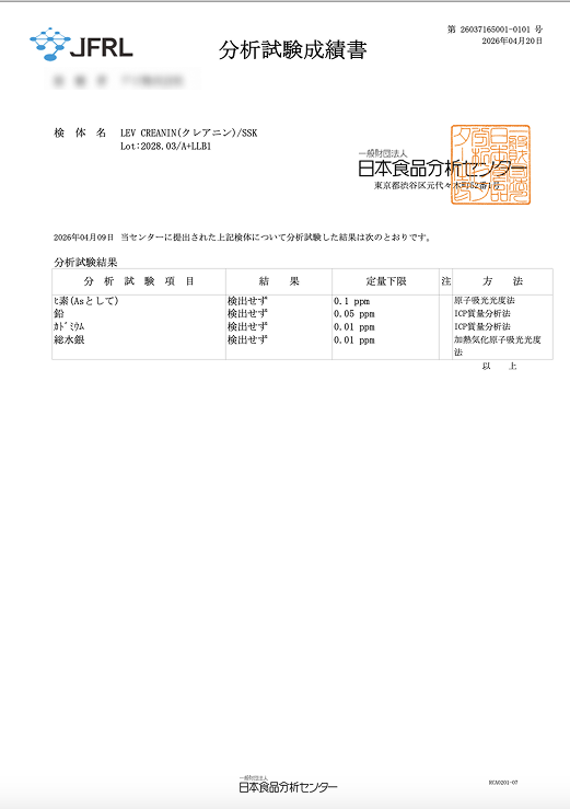 お客様に毎日安心して摂取いただくため、本製品は第三者機関による重金属検査をクリアしています。検査項目は、ヒ素、鉛、カドミウム、水銀の4元素です。
