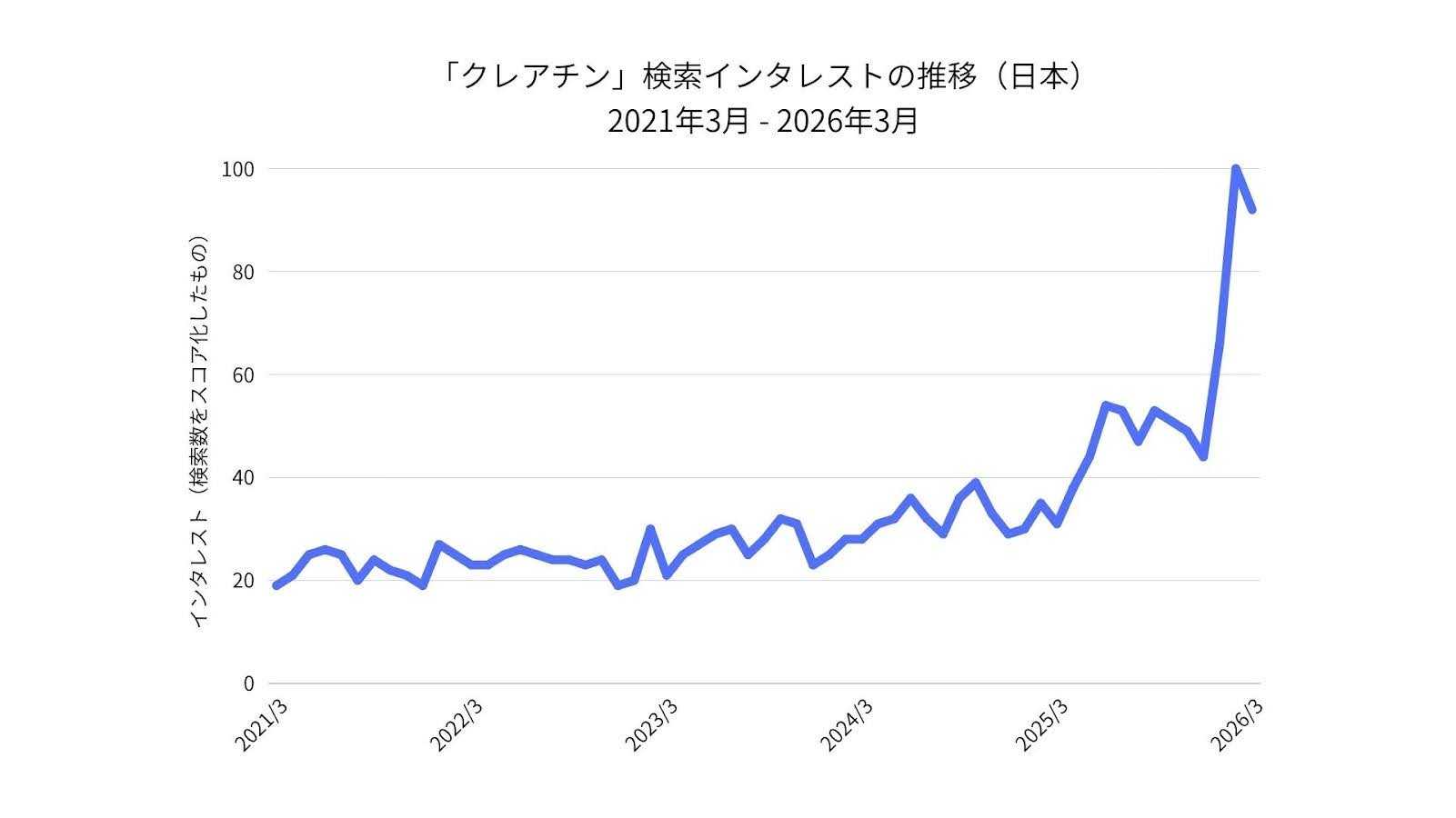 この流れは、日本国内にも確実に波及しています。Google検索トレンドのデータによると、日本における「クレアチン」の検索数は、2021年から2026年の5年間で約500%にまで急伸。SNSやメディアにおける専門家の発信により、従来の「一部のプロアスリートが飲むもの」という認識から、現在では効率的な身体づくりや日々のコンディション維持を求める幅広い一般層へと、徐々にその関心が拡大しています。
